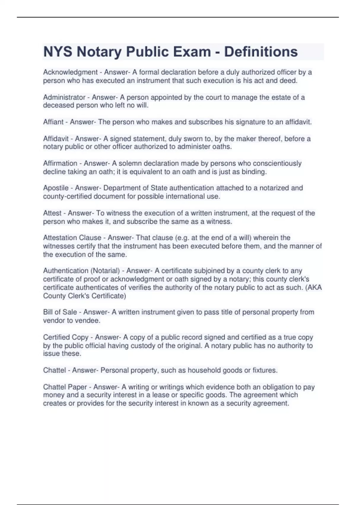 NYS Notary Public Exam - Definitions