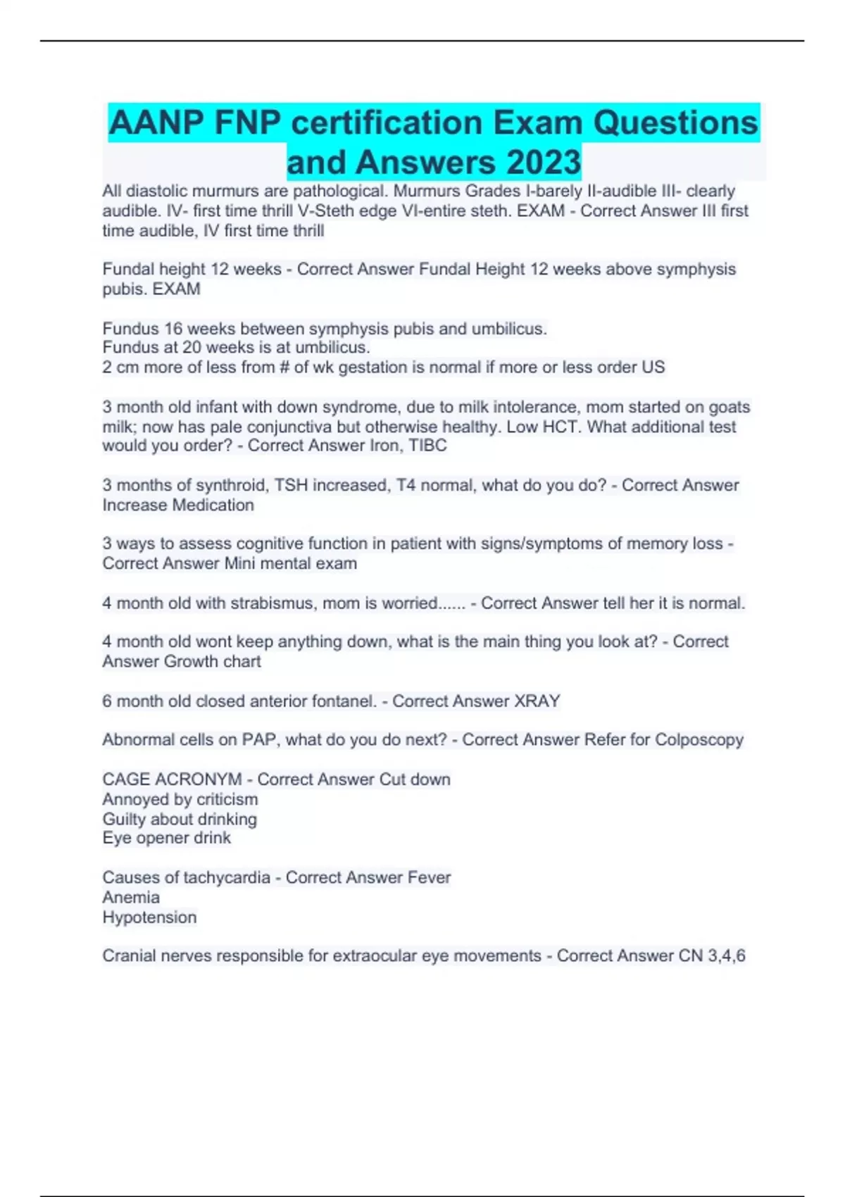 All diastolic murmurs are pathological. Murmurs Grades I-barely II-audible III- clearly audible. IV- first time thrill V-Steth edge VI-entire steth. EXAM - Correct Answer III first time audible, IV first time thrill Fundal height 12 weeks - Correct Answer Fundal Height 12 weeks above symphysis pubis. EXAM Fundus 16 weeks between symphysis pubis and umbilicus. Fundus at 20 weeks is at umbilicus. 2 cm more of less from # of wk gestation is normal if more or less order US 3 month old infant with down syndrome, due to milk intolerance, mom started on goats milk; now has pale conjunctiva but otherwise healthy. Low HCT. What additional test would you order? - Correct Answer Iron, TIBC 3 months of synthroid, TSH increased, T4 normal, what do you do? - Correct Answer Increase Medication 3 ways to assess cognitive function in patient with signs/symptoms of memory loss - Correct Answer Mini mental exam 4 month old with strabismus, mom is worried...... - Correct Answer tell her it is normal. 4 month old wont keep anything down, what is the main thing you look at? - Correct Answer Growth chart 6 month old closed anterior fontanel. - Correct Answer XRAY Abnormal cells on PAP, what do you do next? - Correct Answer Refer for Colposcopy CAGE ACRONYM - Correct Answer Cut down Annoyed by criticism Guilty about drinking Eye opener drink Causes of tachycardia - Correct Answer Fever Anemia Hypotension Cranial nerves responsible for extraocular eye movements - Correct Answer CN 3,4,6