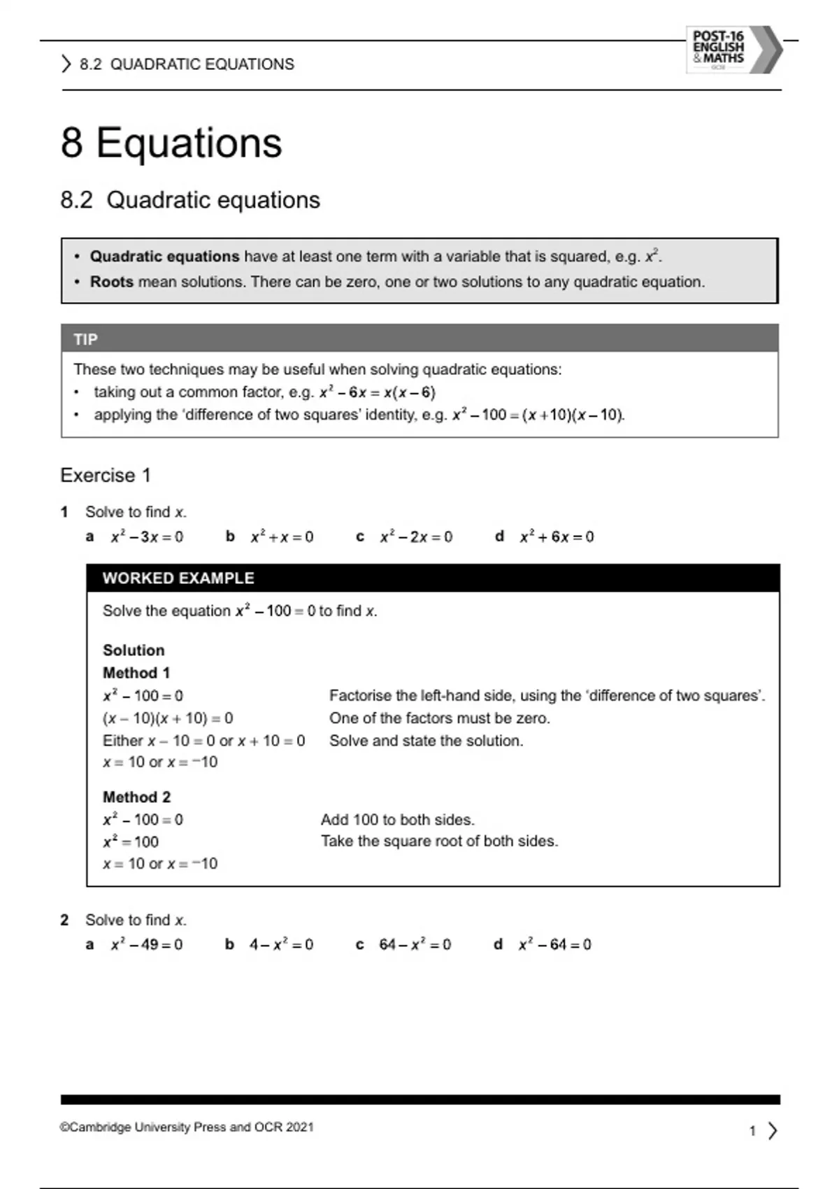 OCR GCSE 8.2 MATHS QUADRATIC EQUATIONS EXAM