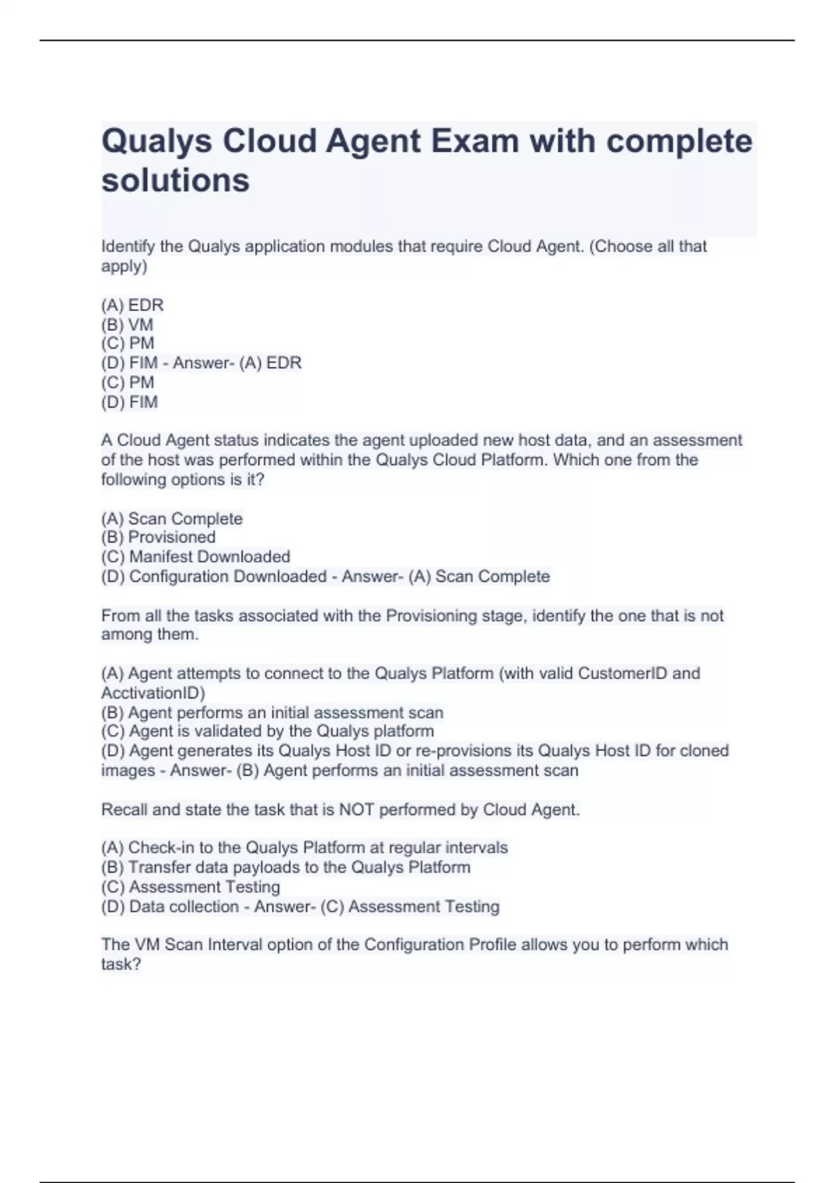 Identify the Qualys application modules that require Cloud Agent. (Choose all that apply) (A) EDR (B) VM (C) PM (D) FIM - Answer- (A) EDR (C) PM (D) FIM A Cloud Agent status indicates the agent uploaded new host data, and an assessment of the host was performed within the Qualys Cloud Platform. Which one from the following options is it? (A) Scan Complete (B) Provisioned (C) Manifest Downloaded (D) Configuration Downloaded - Answer- (A) Scan Complete From all the tasks associated with the Provisioning stage, identify the one that is not among them. (A) Agent attempts to connect to the Qualys Platform (with valid CustomerID and AcctivationID) (B) Agent performs an initial assessment scan (C) Agent is validated by the Qualys platform (D) Agent generates its Qualys Host ID or re-provisions its Qualys Host ID for cloned images - Answer- (B) Agent performs an initial assessment scan Recall and state the task that is NOT performed by Cloud Agent. (A) Check-in to the Qualys Platform at regular intervals (B) Transfer data payloads to the Qualys Platform (C) Assessment Testing (D) Data collection - Answer- (C) Assessment Testing The VM Scan Interval option of the Configuration Profile allows you to perform which task? (A) Configure frequency for SCA scan (B) Configure frequency for VM scan (C) Configure frequency for policy compliance scan (D) Configure Agent status interval - Answer- (A) Configure frequency for SCA scan Identify the query that will help you find agents that have not checked-in within the last 7 days. (A) lastCheckedIn (not, 7days) (B) not lastCheckedIn (7days) (C) not lastCheckedIn > now-7d (D) lastCheckedIn > now-7d - Answer- (C) not lastCheckedIn > now-7d As a "best practice," you are asked to associate an Activation Key with an Asset Tag, that uses the _________________ Rule Engine. (A) Open Ports (B) No Dynamic Rule (C) IP Address in Range(s) (D) Asset Name Contains - Answer- (B) No Dynamic Rule Recognize who initiates the communication sessions between Cloud Agent and the Qualys Platform (A) Either Cloud Agent or the Qualys Platform (B) Neither Cloud Agent nor the Qualys Platform (C) Cloud Agent (D) Qualys Platform - Answer- (C) Cloud Agent The 'Delta Upload Interval' and 'Chunk sizes for file fragment uploads' settings in the Configuration Profile, are designed to impact the way an agent uses _________________ . (A) Host Memory (B) Network Bandwidth (C) Host CPU (D) Disk Space - Answer- (B) Network Bandwidth Your manager has asked you to validate a successful Cloud Agent installation. What will you look for? (A) The 'Installation Succesful' message is displayed in the 'Command Prompt' or 'Terminal' window (B) Successful communication status codes are recorded in the agent log file. (C) The Qualys Cloud Agent process is running on the host. (D) The host has received a unique Qualys Host ID. - Answer- (B) Successful communication status codes are recorded in the agent log file. (C) The Qualys Cloud Agent process is running on the host. (D) The host has received a unique Qualys Host ID. What is the recommended approach for removing Cloud Agent from its host? (A) Use Asset Search to locate the agent host, and select the "Purge" option from the "Actions" menu. (B) Kill the "Cloud Agent" process, and reboot the host. (C) Manually remove all "Cloud Agent" files and programs. (D) Use the "Uninstall Agent" option from the host's "Quick Actions" menu. - Answer- (D) Use the "Uninstall Agent" option from the host's "Quick Actions" menu. By default, a Cloud Agent Activation Key is: (A) Set to expire 12 months from its creation date. (B) Unlimited - it allows you to add any number of agents at any time. (C) Limited to 1000 host assets. (D) Limited to 1000 host assets and set to expire 12 months from its creation date. - Answer- (B) Unlimited - it allows you to add any number of agents at any time. If you've configured the CPU Limit to 20%, for a group of Windows agents, that means the agents will use: (A) More than 20% of one core. (B) More than 20% of all cores (C) Up to 20% CPU of one core. (D) Up to 20% CPU of all cores. - Answer- (C) Up to 20% CPU of one core. You want your Linux Agents the to give greatest performance. Which of the following 'CPU Throttle' settings will you configure? (A) 0 ms (B) 250 ms (C) 750 ms (D) 1000 ms - Answer- (A) 0 ms Identify the Qualys application modules that collect data at regular (user-defined) intervals. (Select all that apply) (A) Vulnerability Management (VM) (B) Policy Compliance (PC) (C) FIM (D) Security Configuration Assessment (SCA) - Answer- (A) Vulnerability Management (VM) (B) Policy Compliance (PC) (D) Security Configuration Assessment (SCA) Which of the following are required components of every agent installation? (Select all that apply) (A) Agent Blackout Windows (B) Agent Proxy Configuration (C) Agent Installation Command (D) Agent Installer - Answer- (C) Agent Installation Command (D) Agent Installer After explaining the Cloud Agent application to your new colleague, he has asked you what is done in the case of a duplicate UUID? Your answer will be, the platform will_______. (A) Download a new Manifest (B) Delete the agent (C) Purge the agent (D) Re-provision the agent to ensure a unique ID - Answer- (D) Re-provision the agent to ensure a unique ID The __________ Asset Tag is automatically assigned to a Cloud Agent host. (A) Malware Domain Assets (B) Cloud Agent (C) Asset Group (D) Business Units - Answer- (B) Cloud Agent Which Cloud Agent status indicates an agent was upgraded to a new version as part of the update process? (A) Manifest Downloaded (B) Provisioned (C) Configuration Downloaded (D) Agent Downloaded - Answer- (D) Agent Downloaded Which of the following search queries will display a list of all agent host assets? (A) :ALL (B) :"Cloud Agent" (C) :CA (D) :Qagent - Answer- (B)