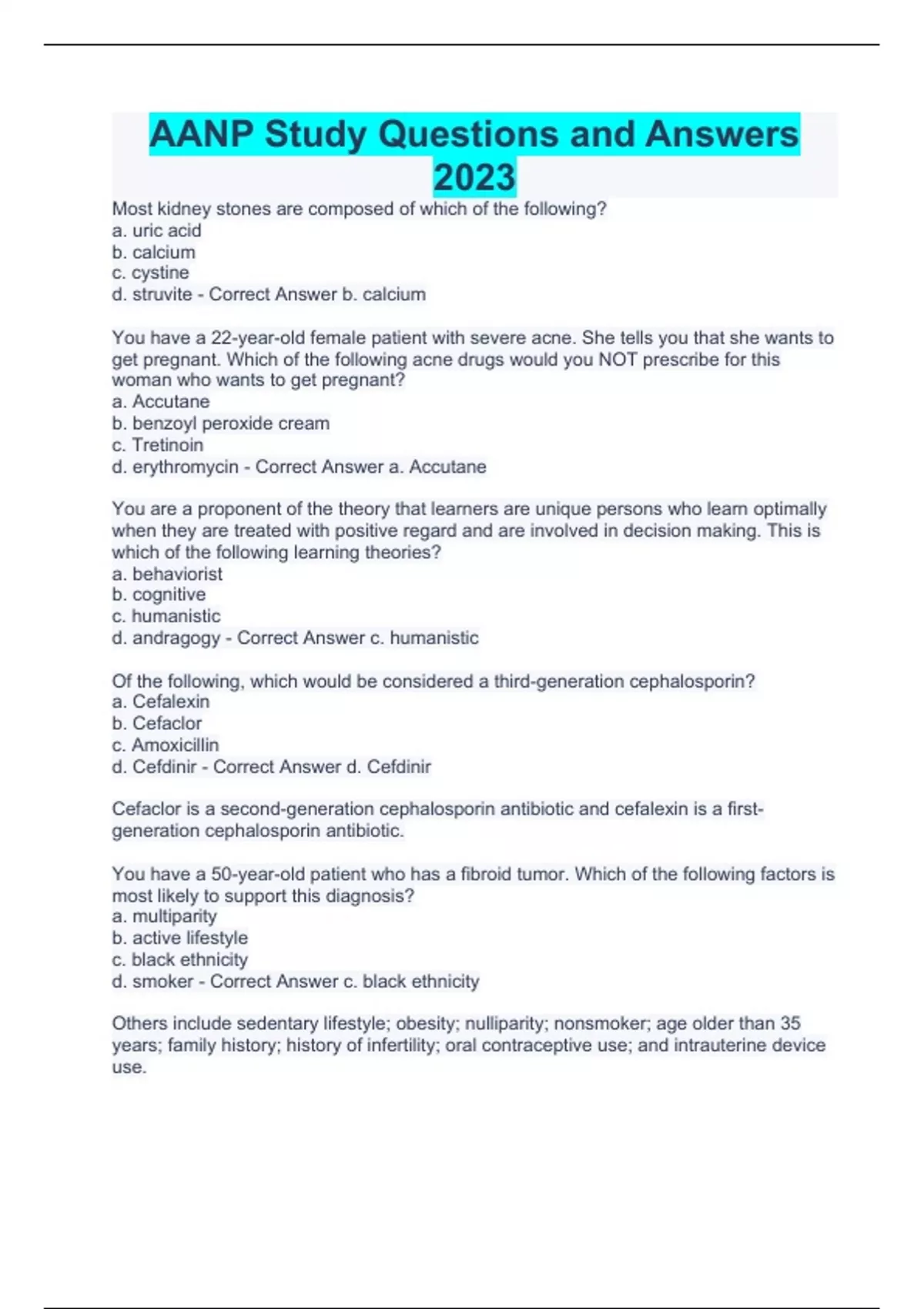 Most kidney stones are composed of which of the following? a. uric acid b. calcium c. cystine d. struvite - Correct Answer b. calcium You have a 22-year-old female patient with severe acne. She tells you that she wants to get pregnant. Which of the following acne drugs would you NOT prescribe for this woman who wants to get pregnant? a. Accutane b. benzoyl peroxide cream c. Tretinoin d. erythromycin - Correct Answer a. Accutane You are a proponent of the theory that learners are unique persons who learn optimally when they are treated with positive regard and are involved in decision making. This is which of the following learning theories? a. behaviorist b. cognitive c. humanistic d. andragogy - Correct Answer c. humanistic Of the following, which would be considered a third-generation cephalosporin? a. Cefalexin b. Cefaclor c. Amoxicillin d. Cefdinir - Correct Answer d. Cefdinir Cefaclor is a second-generation cephalosporin antibiotic and cefalexin is a first-generation cephalosporin antibiotic. You have a 50-year-old patient who has a fibroid tumor. Which of the following factors is most likely to support this diagnosis? a. multiparity b. active lifestyle c. black ethnicity d. smoker - Correct Answer c. black ethnicity Others include sedentary lifestyle; obesity; nulliparity; nonsmoker; age older than 35 years; family history; history of infertility; oral contraceptive use; and intrauterine device use.
