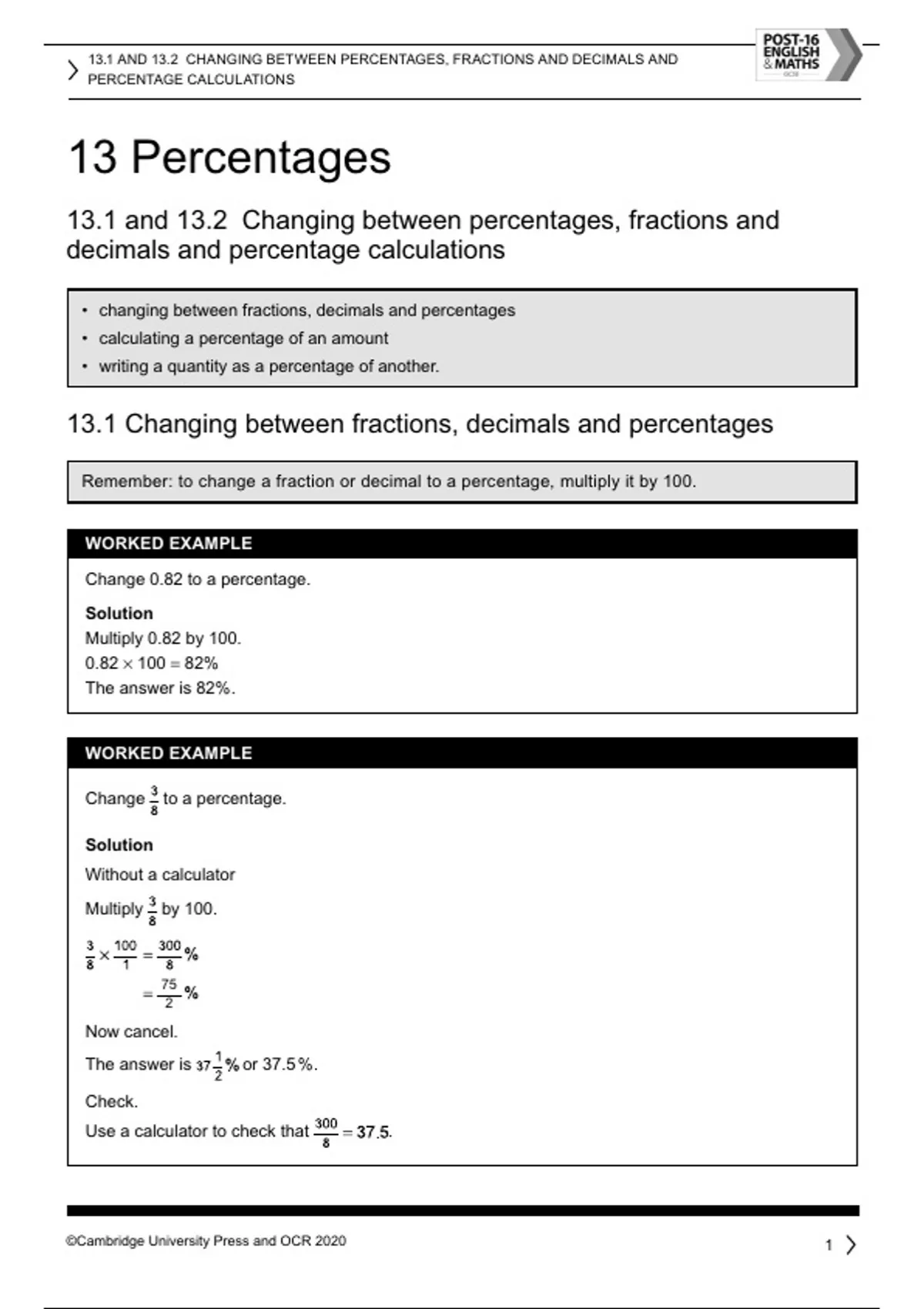 OCR GCSE MATHS 13.1 AND 13.2 CHANGING BETWEEN PERCENTAGES, FRACTIONS AND DECIMALS AND PERCENTAGE CALCULATIONS EXAM