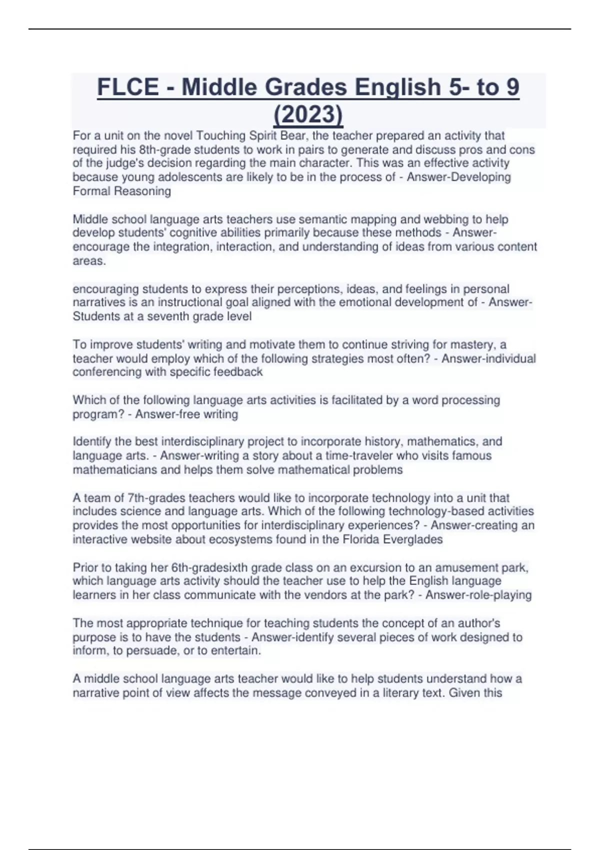 FLCE - Middle Grades English 5- to 9 (2023) For a unit on the novel Touching Spirit Bear, the teacher prepared an activity that required his 8th-grade students to work in pairs to generate and discuss pros and cons of the judge's decision regarding the main character. This was an effective activity because young adolescents are likely to be in the process of - Answer-Developing Formal Reasoning Middle school language arts teachers use semantic mapping and webbing to help develop students' cognitive abilities primarily because these methods - Answerencourage the integration, interaction, and understanding of ideas from various content areas. encouraging students to express their perceptions, ideas, and feelings in personal narratives is an instructional goal aligned with the emotional development of - AnswerStudents at a seventh grade level To improve students' writing and motivate them to continue striving for mastery, a teacher would employ which of the following strategies most often? - Answer-individual conferencing with specific feedback Which of the following language arts activities is facilitated by a word processing program? - Answer-free writing Identify the best interdisciplinary project to incorporate history, mathematics, and language arts. - Answer-writing a story about a time-traveler who visits famous mathematicians and helps them solve mathematical problems A team of 7th-grades teachers would like to incorporate technology into a unit that includes science and language arts. Which of the following technology-based activities provides the most opportunities for interdisciplinary experiences? - Answer-creating an interactive website about ecosystems found in the Florida Everglades Prior to taking her 6th-gradesixth grade class on an excursion to an amusement park, which language arts activity should the teacher use to help the English language learners in her class communicate with the vendors at the park? - Answer-role-playing The most appropriate technique for teaching students the concept of an author's purpose is to have the students - Answer-identify several pieces of work designed to inform, to persuade, or to entertain. A middle school language arts teacher would like to help students understand how a narrative point of view affects the message conveyed in a literary text. Given this purpose, the teacher should have his students do which of the following activities? Continues...