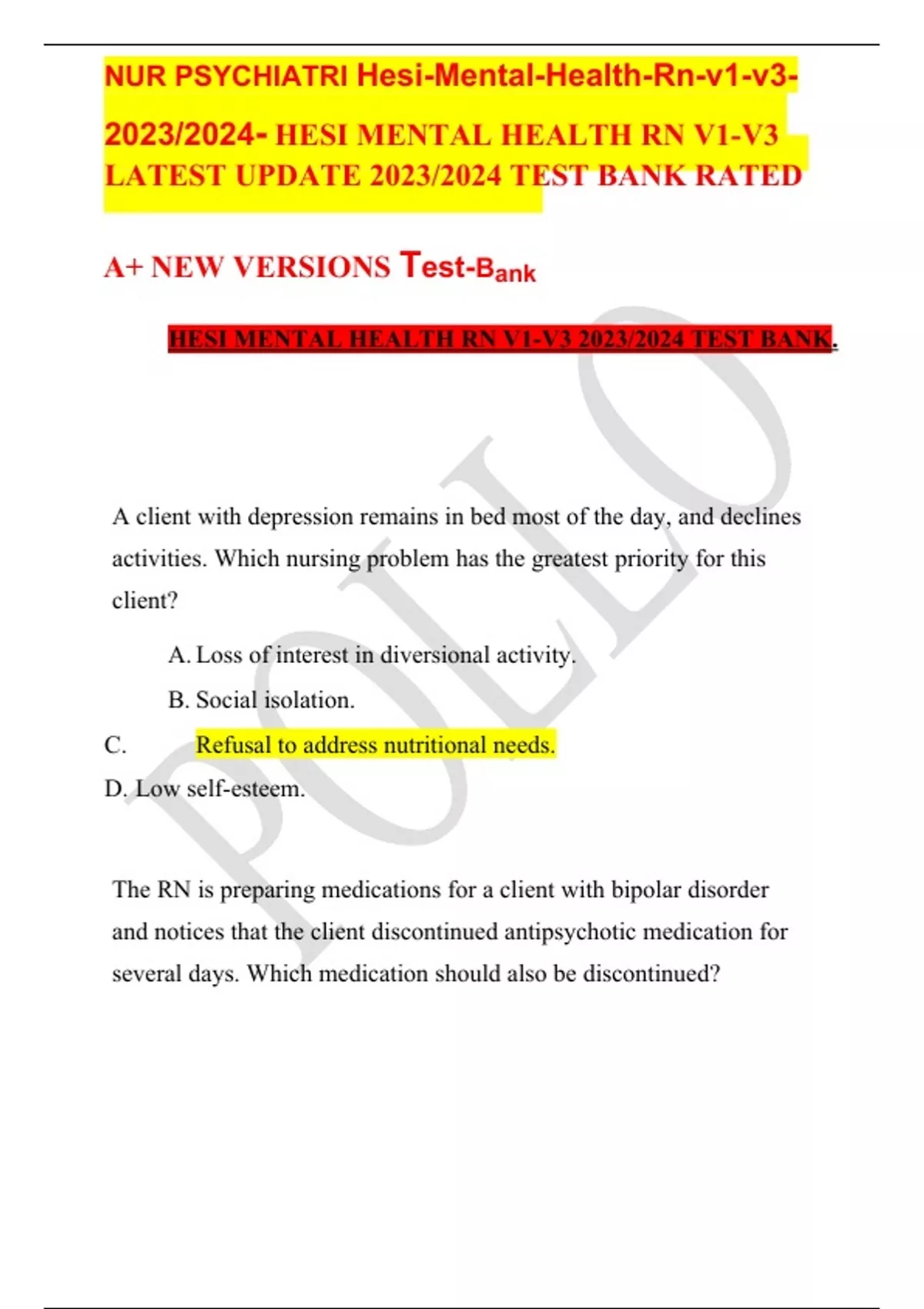A client with depression remains in bed most of the day, and declines activities. Which nursing problem has the greatest priority for this client? A. Loss of interest in diversional activity. B. Social isolation. Refusal to address nutritional needs. C. D. Low self-esteem. The RN is preparing medications for a client with bipolar disorder and notices that the client discontinued antipsychotic medication for several days. Which medication should also be discontinued? NUR PSYCHIATRI Hesi-Mental-Health-Rn-v1-v3- A+ NEW VERSIONS Test-Bank a. Lithium. (Lithotabs) b. Benzotropine (Cogentin). c. Alprazolam (Xanax). d. Magnesium (Milk of Magnesia