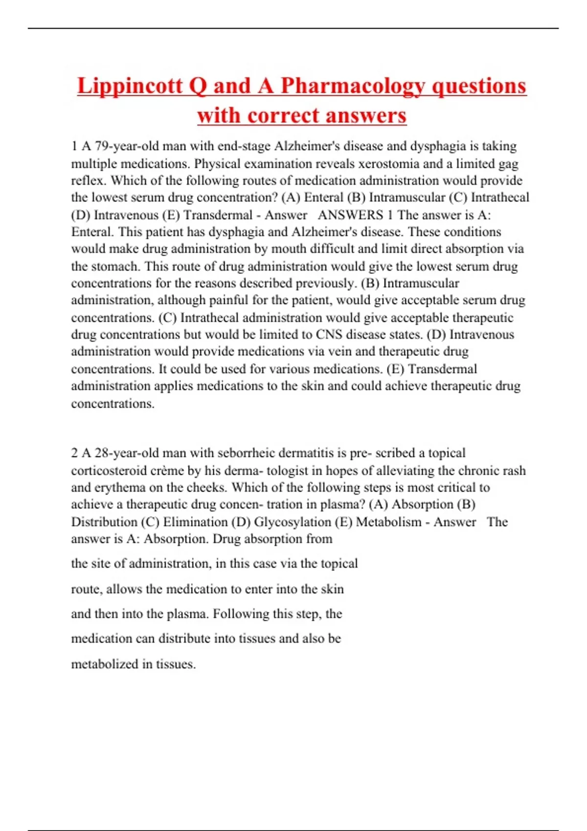 1 A 79-year-old man with end-stage Alzheimer's disease and dysphagia is taking multiple medications. Physical examination reveals xerostomia and a limited gag reflex. Which of the following routes of medication administration would provide the lowest serum drug concentration? (A) Enteral (B) Intramuscular (C) Intrathecal (D) Intravenous (E) Transdermal - Answer ANSWERS 1 The answer is A: Enteral. This patient has dysphagia and Alzheimer's disease. These conditions would make drug administration by mouth difficult and limit direct absorption via the stomach. This route of drug administration would give the lowest serum drug concentrations for the reasons described previously. (B) Intramuscular administration, although painful for the patient, would give acceptable serum drug concentrations. (C) Intrathecal administration would give acceptable therapeutic drug concentrations but would be limited to CNS disease states. (D) Intravenous administration would provide medications via vein and therapeutic drug concentrations. It could be used for various medications. (E) Transdermal administration applies medications to the skin and could achieve therapeutic drug concentrations. 2 A 28-year-old man with seborrheic dermatitis is pre- scribed a topical corticosteroid crème by his derma- tologist in hopes of alleviating the chronic rash and erythema on the cheeks. Which of the following steps is most critical to achieve a therapeutic drug concen- tration in plasma? (A) Absorption (B) Distribution (C) Elimination (D) Glycosylation (E) Metabolism - Answer The answer is A: Absorption. Drug absorption from the site of administration, in this case via the topical route, allows the medication to enter into the skin and then into the plasma. Following this step, the medication can distribute into tissues and also be metabolized in tissues.