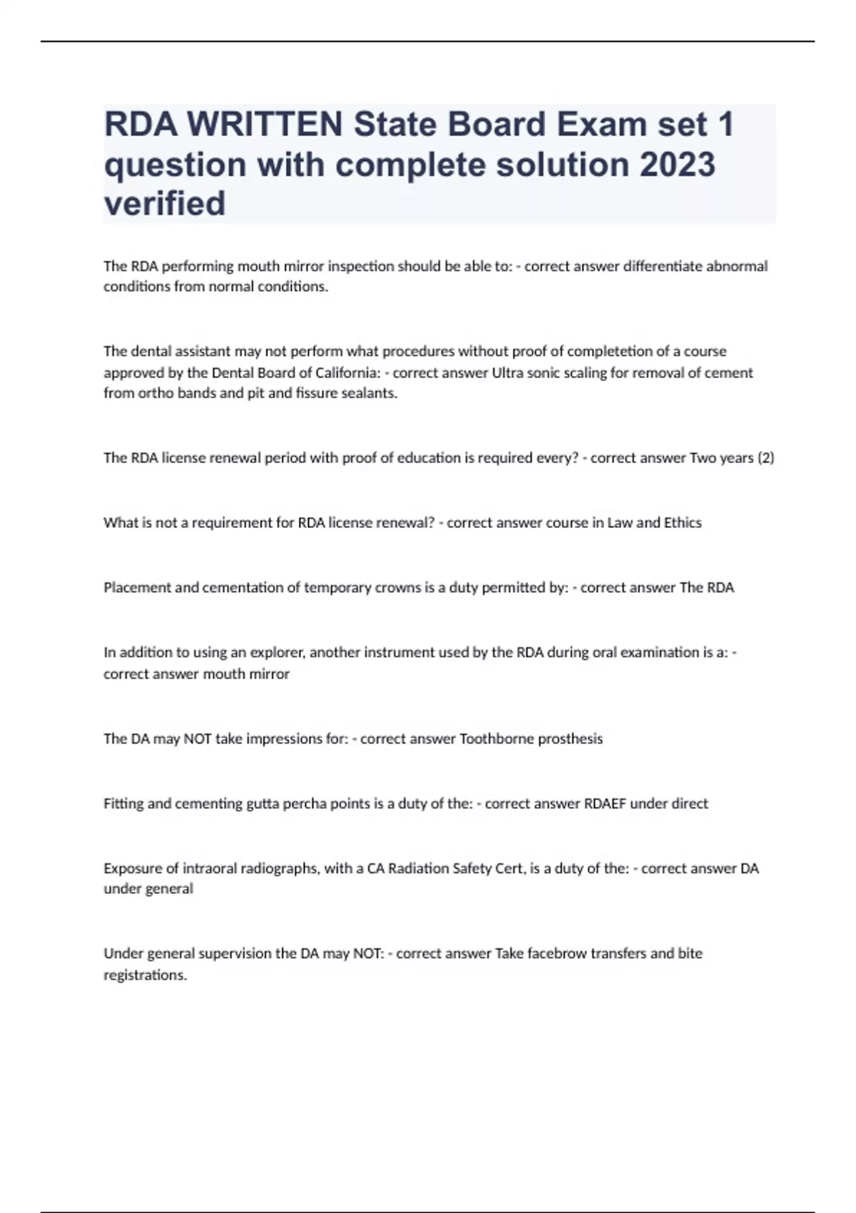 RDA WRITTEN State Board Exam set 1 question with complete solution 2023 verifiedThe RDA performing mouth mirror inspection should be able to: - correct answer differentiate abnormal conditions from normal conditions. The dental assistant may not perform what procedures without proof of completetion of a course approved by the Dental Board of California: - correct answer Ultra sonic scaling for removal of cement from ortho bands and pit and fissure sealants. The RDA license renewal period with proof of education is required every? - correct answer Two years (2) What is not a requirement for RDA license renewal? - correct answer course in Law and Ethics Placement and cementation of temporary crowns is a duty permitted by: - correct answer The RDA In addition to using an explorer, another instrument used by the RDA during oral examination is a: - correct answer mouth mirror The DA may NOT take impressions for: - correct answer Toothborne prosthesis Fitting and cementing gutta percha points is a duty of the: - correct answer RDAEF under direct Exposure of intraoral radiographs, with a CA Radiation Safety Cert, is a duty of the: - correct answer DA under general Under general supervision the DA may NOT: - correct answer Take facebrow transfers and bite registrations.