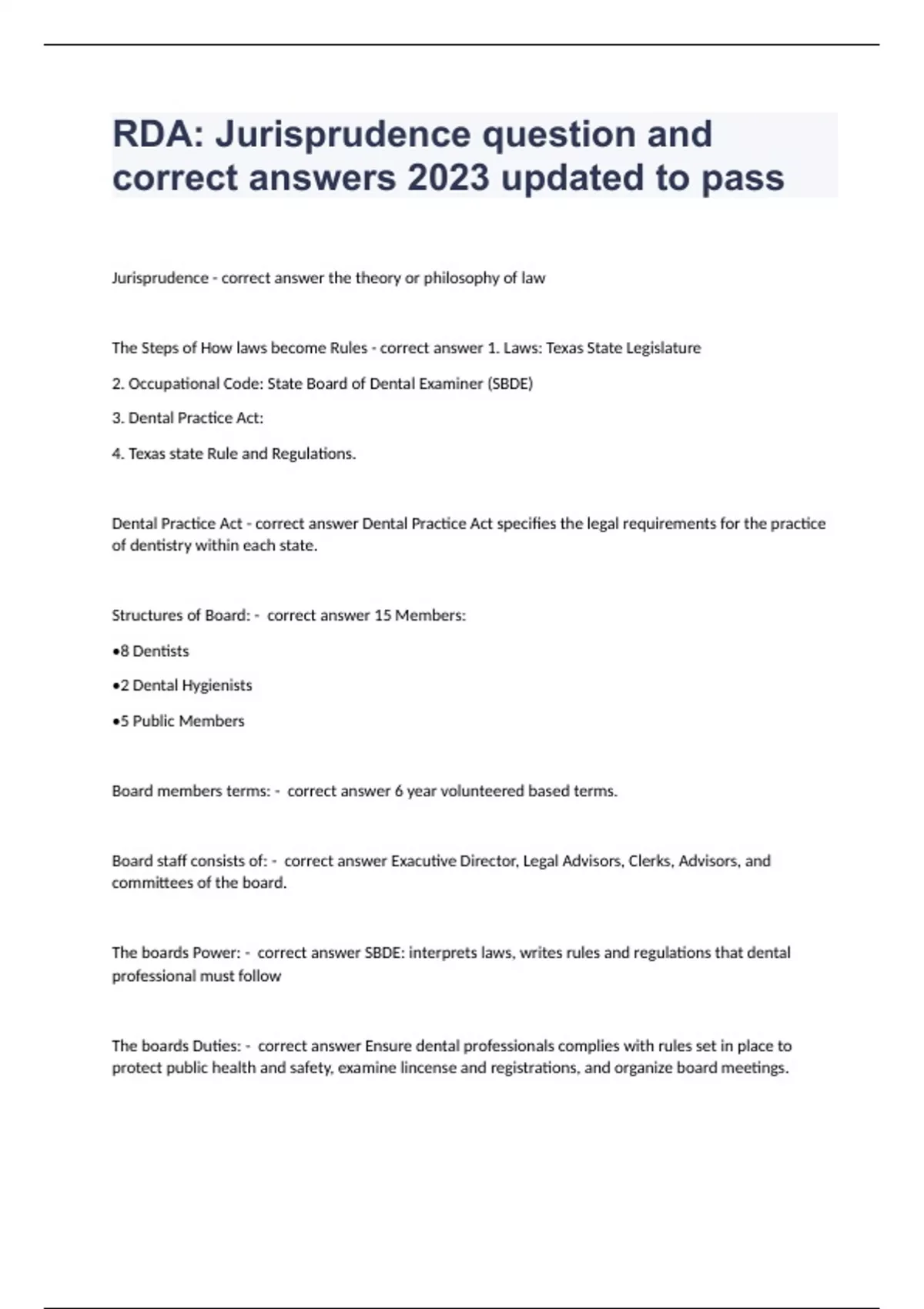 RDA: Jurisprudence question and correct answers 2023 updated to passJurisprudence - correct answer the theory or philosophy of law The Steps of How laws become Rules - correct answer 1. Laws: Texas State Legislature 2. Occupational Code: State Board of Dental Examiner (SBDE) 3. Dental Practice Act: 4. Texas state Rule and Regulations. Dental Practice Act - correct answer Dental Practice Act specifies the legal requirements for the practice of dentistry within each state. Structures of Board: - correct answer 15 Members: •8 Dentists •2 Dental Hygienists •5 Public Members Board members terms: - correct answer 6 year volunteered based terms. Board staff consists of: - correct answer Exacutive Director, Legal Advisors, Clerks, Advisors, and committees of the board. The boards Power: - correct answer SBDE: interprets laws, writes rules and regulations that dental professional must follow The boards Duties: - correct answer Ensure dental professionals complies with rules set in place to protect public health and safety, examine lincense and registrations, and organize board meetings. Who can Practice Dentistry: - correct answer Any personnel that is certfied/ licensed through the State board. Person who does not practice Dentistry: - correct answer Members of faculty at schools, students who are not certfied, labratory workers, physicians who do not represent dentistry. Visual Dental Inspections (screenings): - correct answer •Purpose: to recognize potential problems and refer to dentist. •May be performed by: health car worker, dental assistang, teacher, or school nurse •Gloves, tongue depressed, and light should only be used. •If done in public/group setting=no fee charge. Delegating dentist: - correct answer Are responsible for the dental act that is performed by the health worker the dentist delegated the act to. Duties Delegated to Dental Assistant: - correct answer A licensed dentist may delegate to a qualified dental assisting under either Direct or general supervision. Direct supervision - correct answer Dentist must be in office to authorize function and evaluate procedure when needed General Supervision - correct answer The dentist does not have to be present in order for the dental assistant to perform procedures. Dental assistant duties under DIRECT SUPERVISION: - correct answer •Acts that are reversible: Application of pits/fissure sealants, coronal polishing, and application of flouride Varnish. Dental assistant duties under GENERAL SUPERVISION: - correct answer Taking and processin X-rays, scheduling follow up. Duties that CAN NOT be delegated: - correct answer •Direct pulp capping, pulpotomy, or any endodontic procedure.
