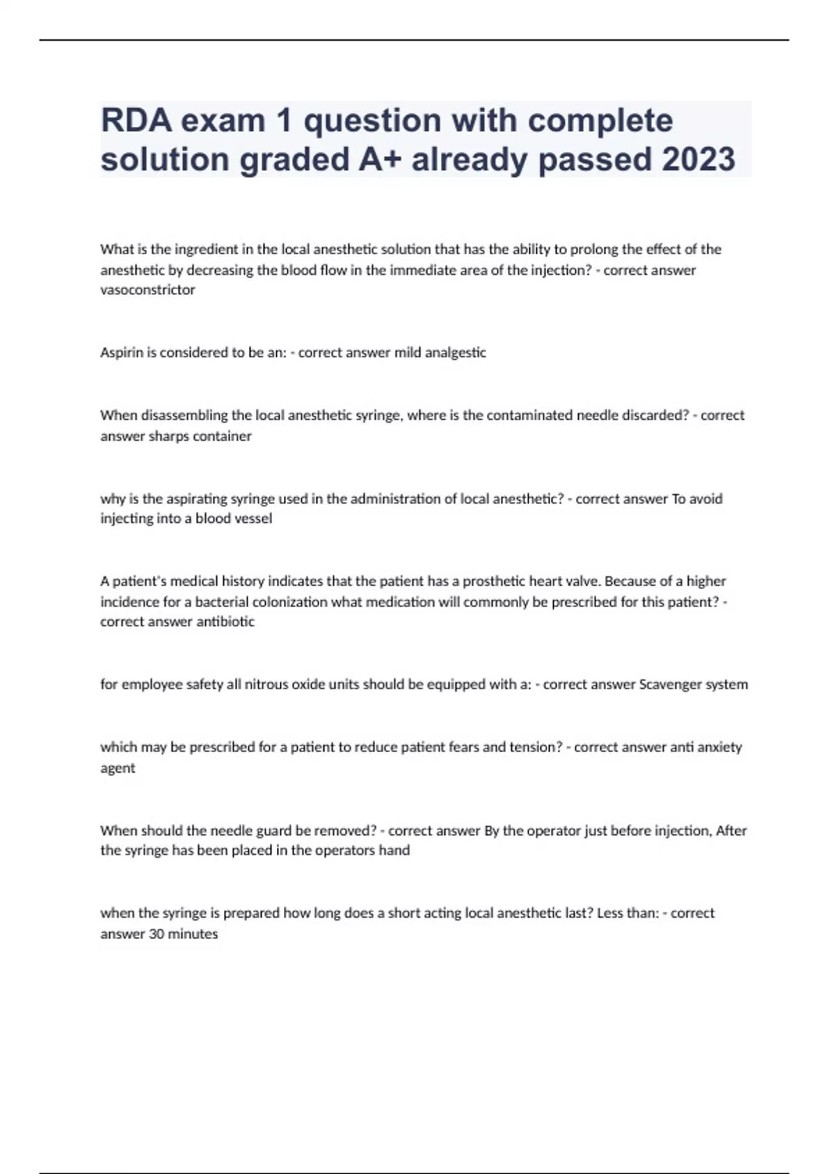 RDA exam 1 question with complete solution graded A+ already passed 2023 What is the ingredient in the local anesthetic solution that has the ability to prolong the effect of the anesthetic by decreasing the blood flow in the immediate area of the injection? - correct answer vasoconstrictor Aspirin is considered to be an: - correct answer mild analgestic When disassembling the local anesthetic syringe, where is the contaminated needle discarded? - correct answer sharps container why is the aspirating syringe used in the administration of local anesthetic? - correct answer To avoid injecting into a blood vessel A patient's medical history indicates that the patient has a prosthetic heart valve. Because of a higher incidence for a bacterial colonization what medication will commonly be prescribed for this patient? - correct answer antibiotic for employee safety all nitrous oxide units should be equipped with a: - correct answer Scavenger system which may be prescribed for a patient to reduce patient fears and tension? - correct answer anti anxiety agent When should the needle guard be removed? - correct answer By the operator just before injection, After the syringe has been placed in the operators hand when the syringe is prepared how long does a short acting local anesthetic last? Less than: - correct answer 30 minutes
