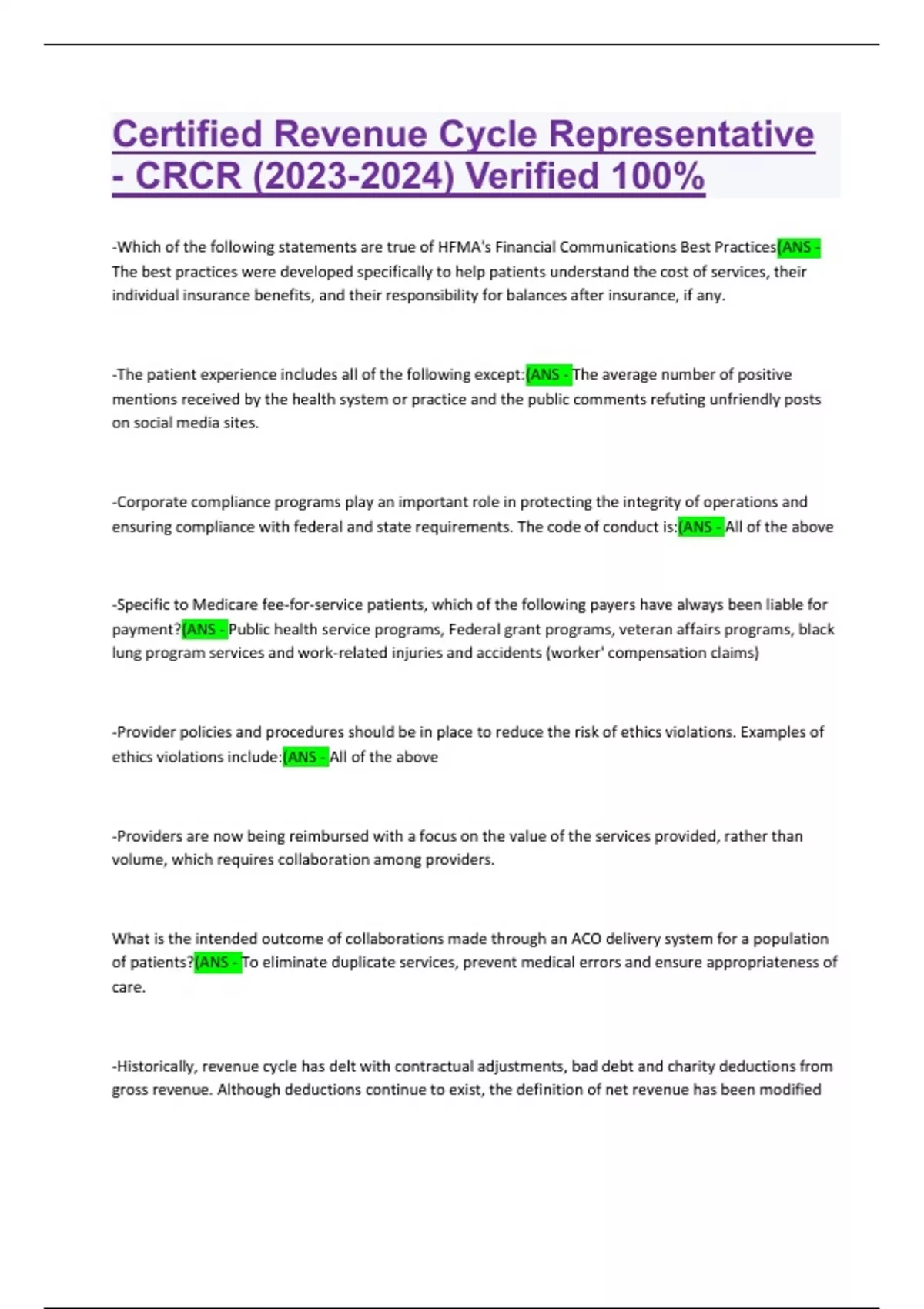Certified Revenue Cycle Representative - CRCR () Verified 100%
