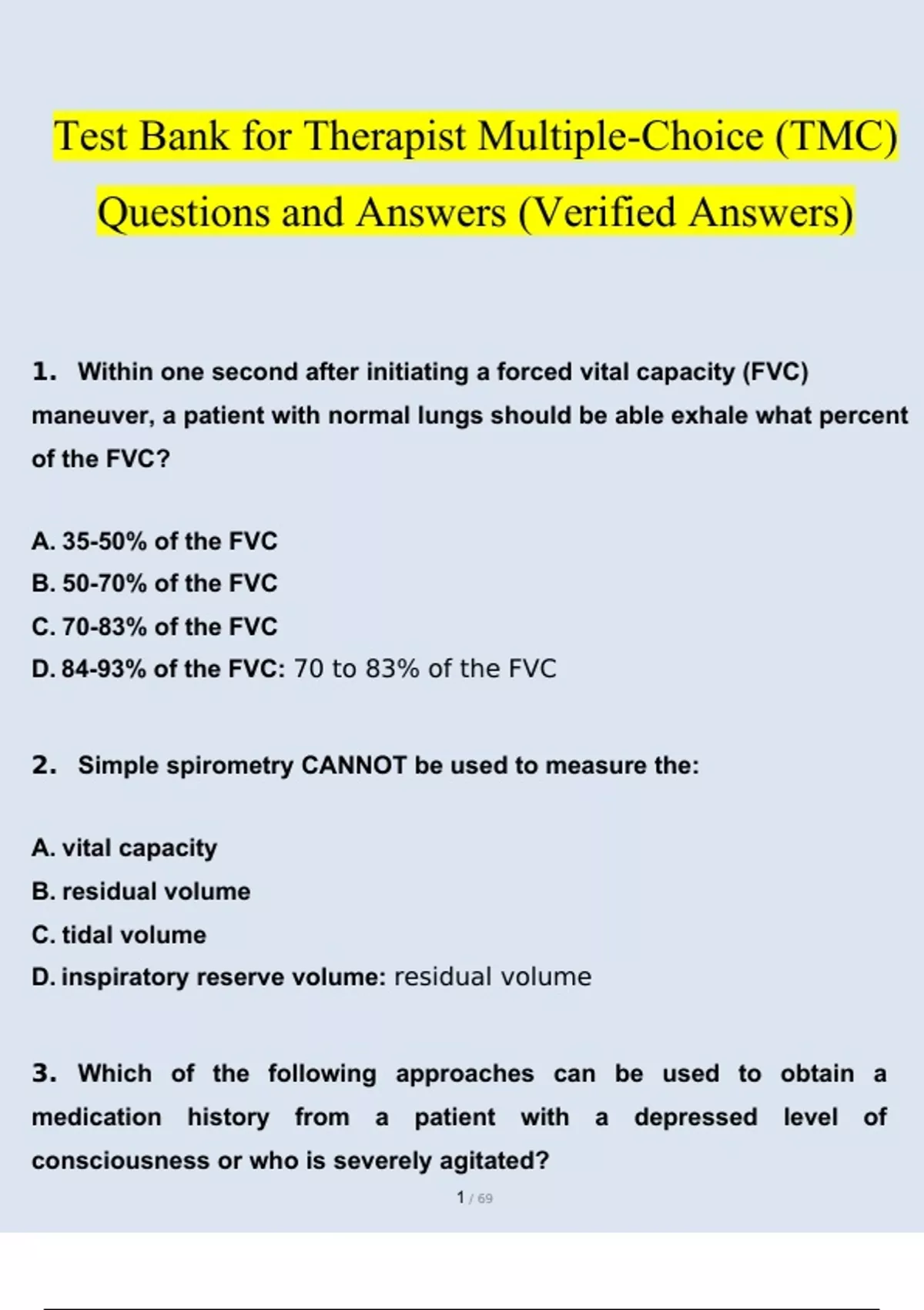 Test Bank for Therapist Multiple-Choice (TMC) Questions and Answers 2023 (Verified Answers) Test Bank for Therapist Multiple-Choice (TMC) Questions and Answers 2023 (Verified Answers)