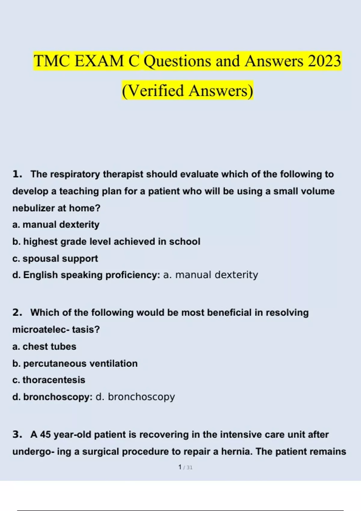 TMC EXAM C Questions and Answers 2023 (Verified 160 Questions) TMC EXAM C Questions and Answers 2023 (Verified 160 Questions)