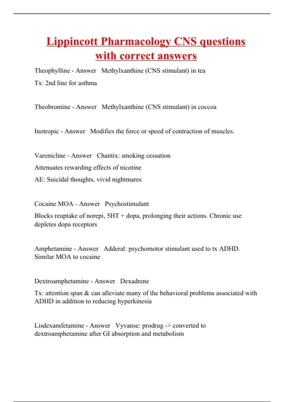 Theophylline - Answer Methylxanthine (CNS stimulant) in tea Tx: 2nd line for asthma Theobromine - Answer Methylxanthine (CNS stimulant) in coccoa Inotropic - Answer Modifies the force or speed of contraction of muscles. Varenicline - Answer Chantix: smoking cessation Attenuates rewarding effects of nicotine AE: Suicidal thoughts, vivid nightmares Cocaine MOA - Answer Psychostimulant Blocks reuptake of norepi, 5HT + dopa, prolonging their actions. Chronic use depletes dopa receptors Amphetamine - Answer Adderal: psychomotor stimulant used to tx ADHD. Similar MOA to cocaine Dextroamphetamine - Answer Dexadrene Tx: attention span & can alleviate many of the behavioral problems associated with ADHD in addition to reducing hyperkinesia Lisdexamfetamine - Answer Vyvanse: prodrug -> converted to dextroamphetamine after GI absorption and metabolism Methylphenidate - Answer Ritalin: schedule 2 CNS-stimulant similar to amphetamine. Tx: ADHD & narcolepsy Blocks dopamine reuptake more than norepinephrine reuptake; may also increase their release. Atomoxetine - Answer Non-stimulant drug used to tx ADHD More selective for inhibition of norepinephrine reuptake.