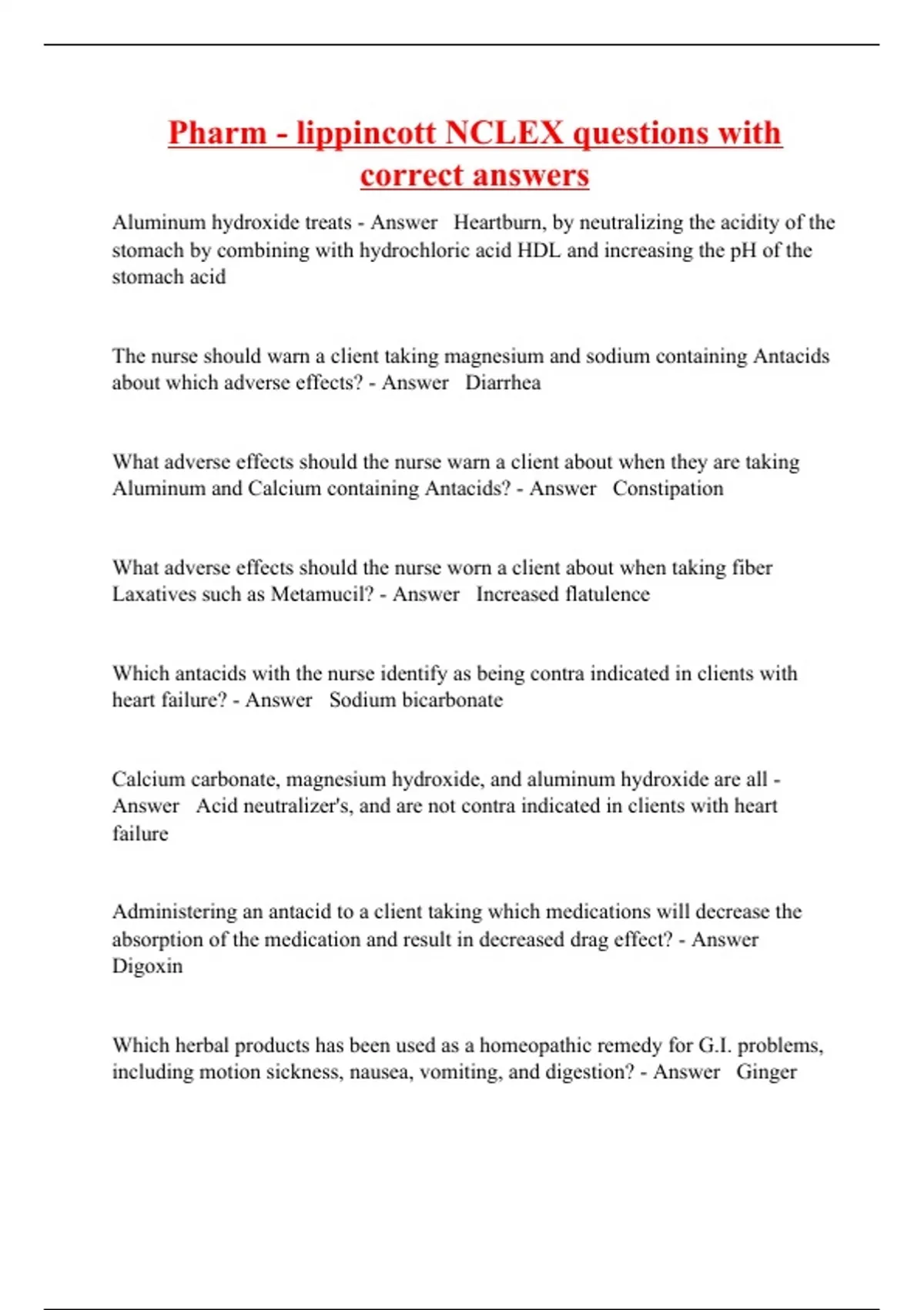 Aluminum hydroxide treats - Answer Heartburn, by neutralizing the acidity of the stomach by combining with hydrochloric acid HDL and increasing the pH of the stomach acid The nurse should warn a client taking magnesium and sodium containing Antacids about which adverse effects? - Answer Diarrhea What adverse effects should the nurse warn a client about when they are taking Aluminum and Calcium containing Antacids? - Answer Constipation What adverse effects should the nurse worn a client about when taking fiber Laxatives such as Metamucil? - Answer Increased flatulence Which antacids with the nurse identify as being contra indicated in clients with heart failure? - Answer Sodium bicarbonate Calcium carbonate, magnesium hydroxide, and aluminum hydroxide are all - Answer Acid neutralizer's, and are not contra indicated in clients with heart failure Administering an antacid to a client taking which medications will decrease the absorption of the medication and result in decreased drag effect? - Answer Digoxin Which herbal products has been used as a homeopathic remedy for G.I. problems, including motion sickness, nausea, vomiting, and digestion? - An