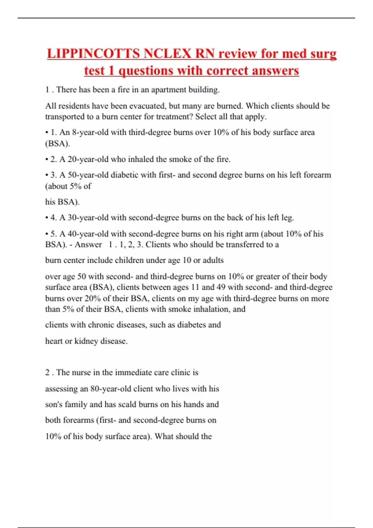 1 . There has been a fire in an apartment building. All residents have been evacuated, but many are burned. Which clients should be transported to a burn center for treatment? Select all that apply. • 1. An 8-year-old with third-degree burns over 10% of his body surface area (BSA). • 2. A 20-year-old who inhaled the smoke of the fire. • 3. A 50-year-old diabetic with first- and second degree burns on his left forearm (about 5% of his BSA). • 4. A 30-year-old with second-degree burns on the back of his left leg. • 5. A 40-year-old with second-degree burns on his right arm (about 10% of his BSA). - Answer 1 . 1, 2, 3. Clients who should be transferred to a burn center include children under age 10 or adults over age 50 with second- and third-degree burns on 10% or greater of their body surface area (BSA), clients between ages 11 and 49 with second- and third-degree burns over 20% of their BSA, clients on my age with third-degree burns on more than 5% of their BSA, clients with smoke inhalation, and clients with chronic diseases, such as diabetes and heart or kidney disease. 2 . The nurse in the immediate care clinic is assessing an 80-year-old client who lives with his son's family and has scald burns on his hands and both forearms (first- and second-degree burns on 10% of his body surface area). What should the