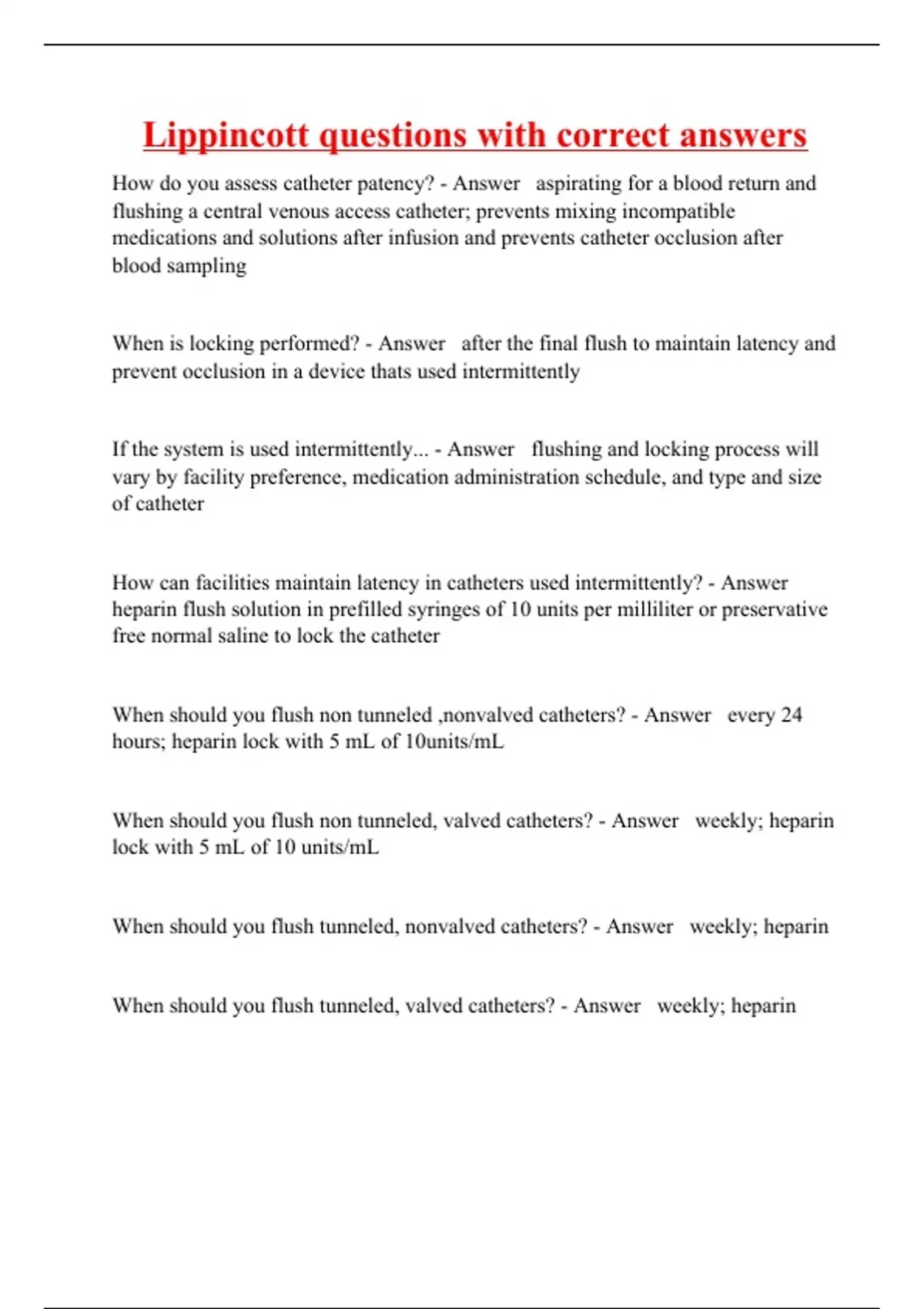How do you assess catheter patency? - Answer aspirating for a blood return and flushing a central venous access catheter; prevents mixing incompatible medications and solutions after infusion and prevents catheter occlusion after blood sampling When is locking performed? - Answer after the final flush to maintain latency and prevent occlusion in a device thats used intermittently If the system is used intermittently... - Answer flushing and locking process will vary by facility preference, medication administration schedule, and type and size of catheter How can facilities maintain latency in catheters used intermittently? - Answer heparin flush solution in prefilled syringes of 10 units per milliliter or preservative free normal saline to lock the catheter When should you flush non tunneled ,nonvalved catheters? - Answer every 24 hours; heparin lock with 5 mL of 10units/mL When should you flush non tunneled, valved catheters? - Answer weekly; heparin lock with 5 mL of 10 units/mL When should you flush tunneled, nonvalved catheters? - Answer weekly; heparin When should you flush tunneled, valved catheters? - Answer weekly; heparin