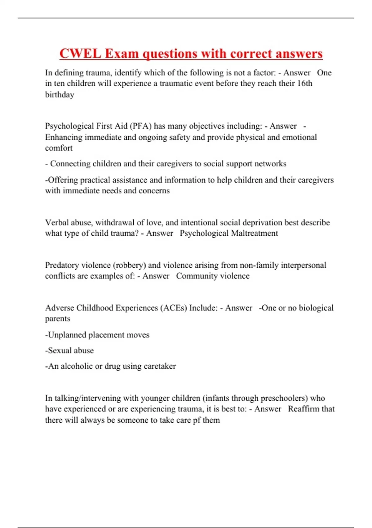 In defining trauma, identify which of the following is not a factor: - Answer One in ten children will experience a traumatic event before they reach their 16th birthday Psychological First Aid (PFA) has many objectives including: - Answer -Enhancing immediate and ongoing safety and provide physical and emotional comfort - Connecting children and their caregivers to social support networks -Offering practical assistance and information to help children and their caregivers with immediate needs and concerns Verbal abuse, withdrawal of love, and intentional social deprivation best describe what type of child trauma? - Answer Psychological Maltreatment Predatory violence (robbery) and violence arising from non-family interpersonal conflicts are examples of: - Answer Community violence Adverse Childhood Experiences (ACEs) Include: - Answer -One or no biological parents -Unplanned placement moves -Sexual abuse -An alcoholic or drug using caretaker In talking/intervening with younger children (infants through preschoolers) who have experienced or are experiencing trauma, it is best to: - Answer Reaffirm that there will always be someone to take care pf them Strategies for working with a child who is having difficult not blaming themselves for what happened to them (placement) and their families should include: - Answer -Asking a child to think how old they were when the trauma took place a