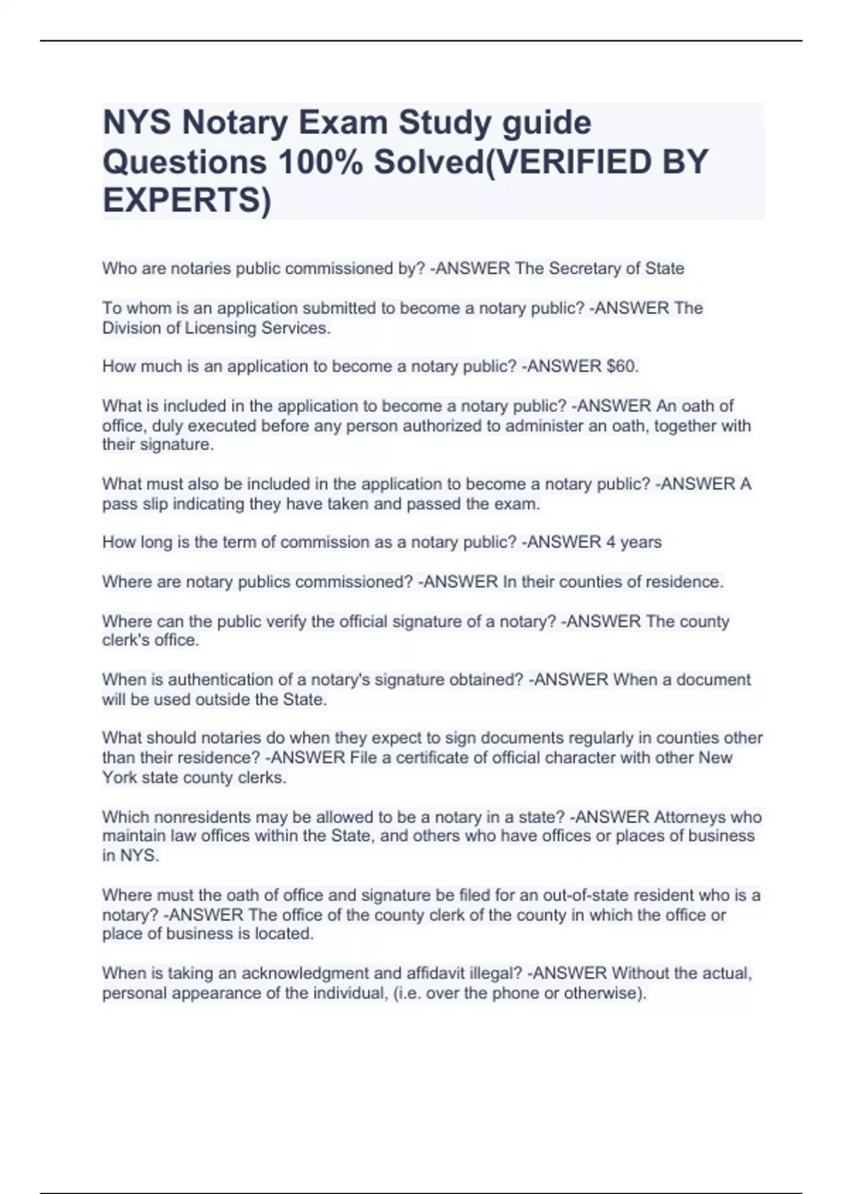 NYS Notary Exam Study guide Questions 100% Solved(VERIFIED BY EXPERTS)