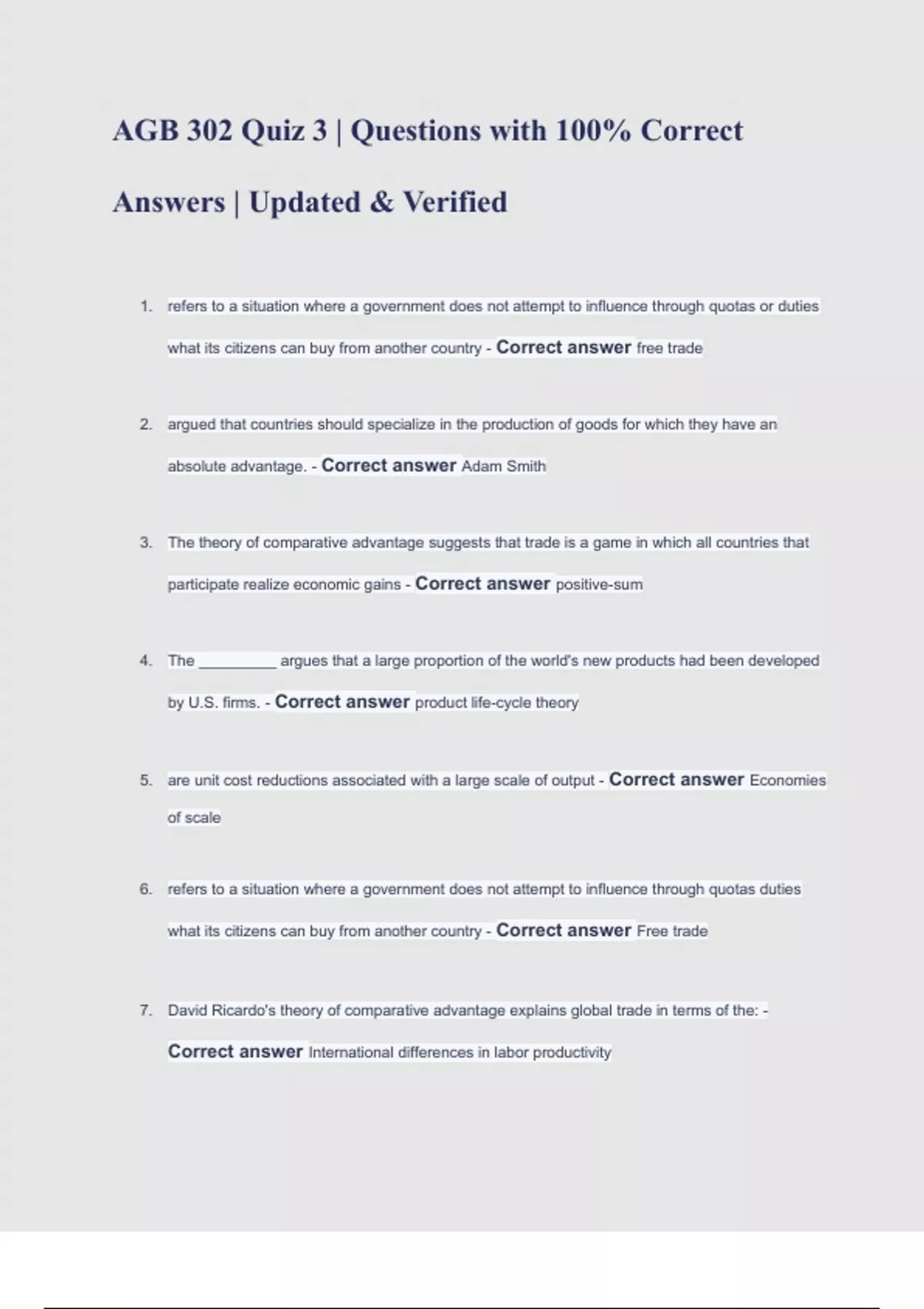 AGB 302 Quiz 3 | Questions with 100% Correct Answers | Updated & Verified