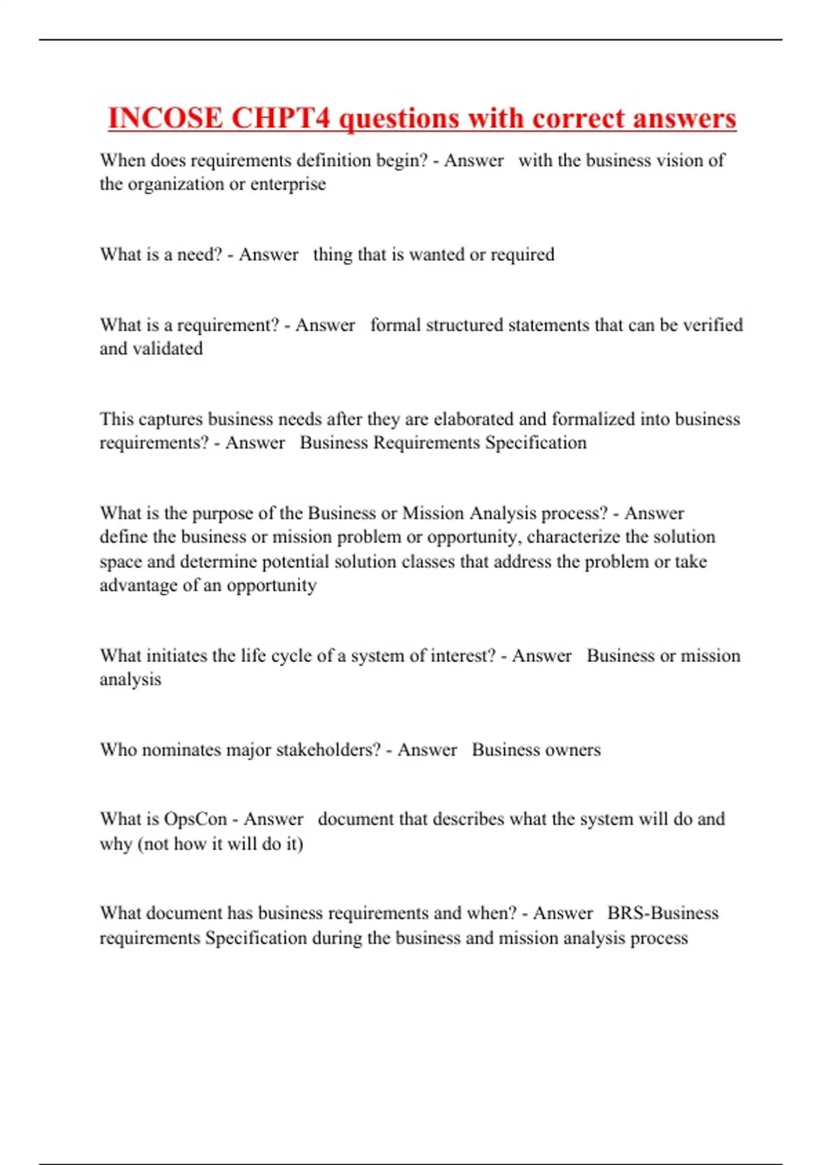 When does requirements definition begin? - Answer with the business vision of the organization or enterprise What is a need? - Answer thing that is wanted or required What is a requirement? - Answer formal structured statements that can be verified and validated This captures business needs after they are elaborated and formalized into business requirements? - Answer Business Requirements Specification What is the purpose of the Business or Mission Analysis process? - Answer define the business or mission problem or opportunity, characterize the solution space and determine potential solution classes that address the problem or take advantage of an opportunity What initiates the life cycle of a system of interest? - Answer Business or mission analysis Who nominates major stakeholders? - Answer Business owners What is OpsCon - Answer document that describes what the system will do and why (not how it will do it) What document has business requirements and when? - Answer BRS-Business requirements Specification during the business and mission analysis process