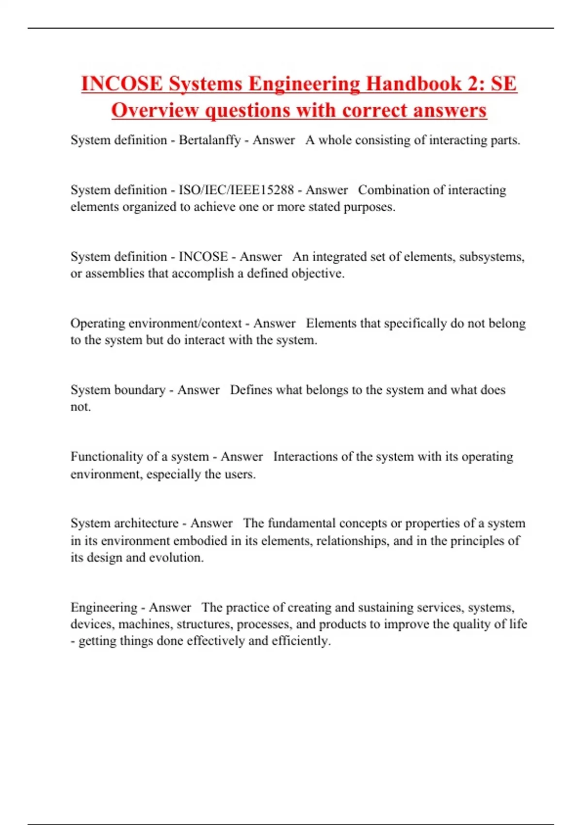 System definition - Bertalanffy - Answer A whole consisting of interacting parts. System definition - ISO/IEC/IEEE15288 - Answer Combination of interacting elements organized to achieve one or more stated purposes. System definition - INCOSE - Answer An integrated set of elements, subsystems, or assemblies that accomplish a defined objective. Operating environment/context - Answer Elements that specifically do not belong to the system but do interact with the system. System boundary - Answer Defines what belongs to the system and what does not. Functionality of a system - Answer Interactions of the system with its operating environment, especially the users. System architecture - Answer The fundamental concepts or properties of a system in its environment embodied in its elements, relationships, and in the principles of its design and evolution. Engineering - Answer The practice of creating and sustaining services, systems, devices, machines, structures, processes, and products to improve the quality of life - getting things done effectively and efficiently.