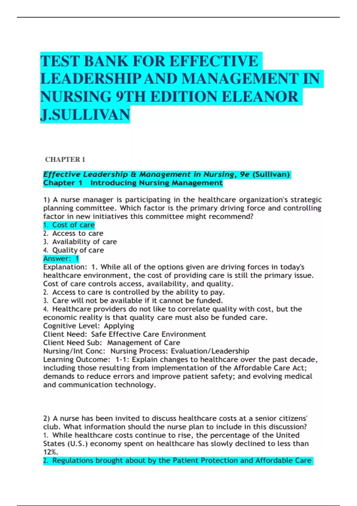 TEST BANK FOR EFFECTIVE LEADERSHIP AND MANAGEMENT IN NURSING 9TH EDITION ELEANOR J.SULLIVAN