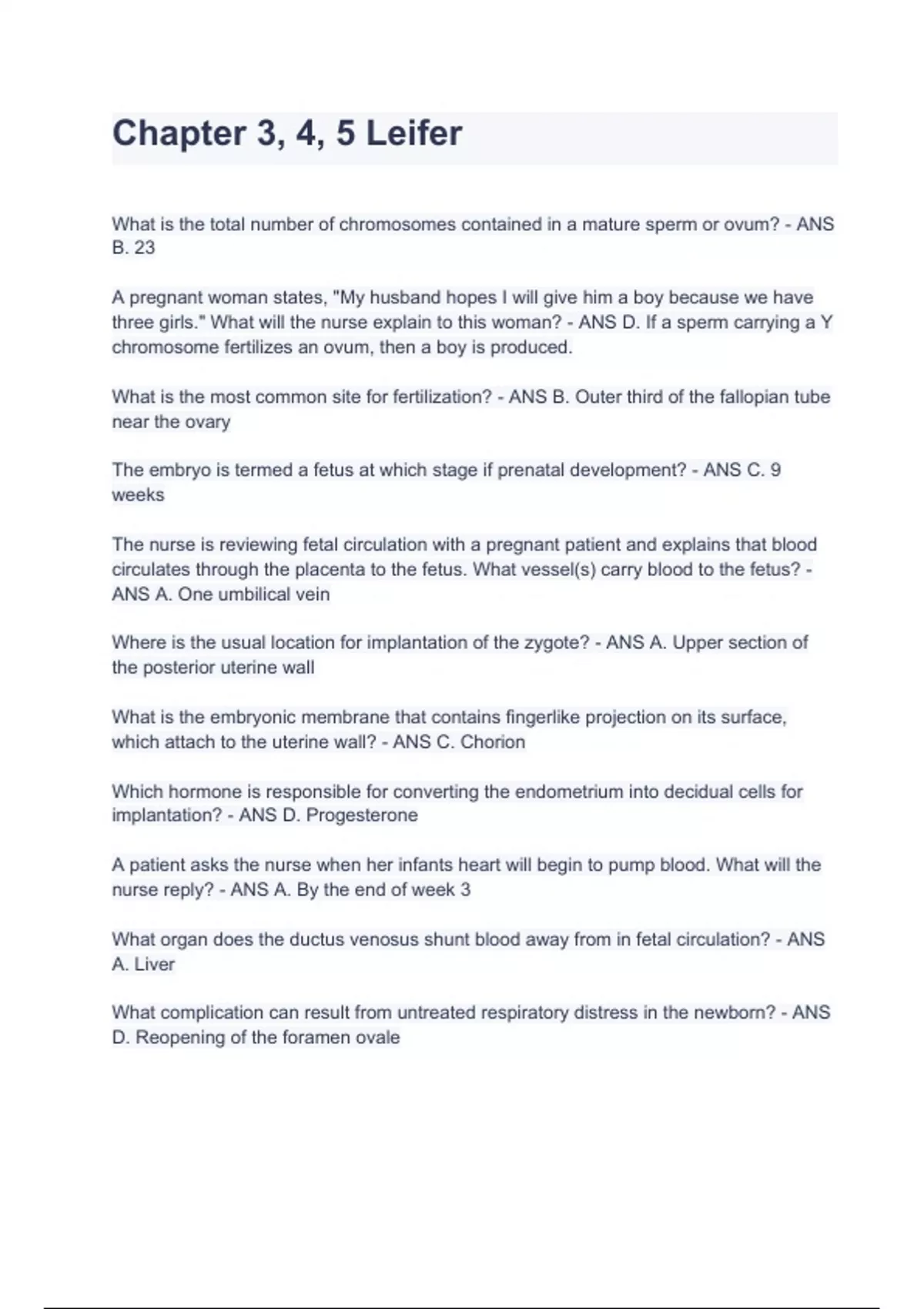 Chapter 3, 4, 5 Leifer VERIFIED What is the total number of chromosomes contained in a mature sperm or ovum? - ANS B. 23 A pregnant woman states, "My husband hopes I will give him a boy because we have three girls." What will the nurse explain to this woman? - ANS D. If a sperm carrying a Y chromosome fertilizes an ovum, then a boy is produced. What is the most common site for fertilization? - ANS B. Outer third of the fallopian tube near the ovary The embryo is termed a fetus at which stage if prenatal development? - ANS C. 9 weeks The nurse is reviewing fetal circulation with a pregnant patient and explains that blood circulates through the placenta to the fetus. What vessel(s) carry blood to the fetus? - ANS A. One umbilical vein Where is the usual location for implantation of the zygote? - ANS A. Upper section of the posterior uterine wall