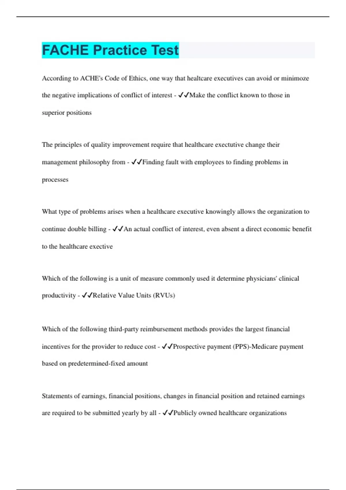 According to ACHE's Code of Ethics, one way that healtcare executives can avoid or minimoze the negative implications of conflict of interest - Make the conflict known to those in superior positions The principles of quality improvement require that healthcare exectutive change their management philosophy from - Finding fault with employees to finding problems in processes What type of problems arises when a healthcare executive knowingly allows the organization to continue double billing - An actual conflict of interest, even absent a direct economic benefit to the healthcare exective Which of the following is a unit of measure commonly used it determine physicians' clinical productivity - Relative Value Units (RVUs) Which of the following third-party reimbursement methods provides the largest financial incentives for the provider to reduce cost - Prospective payment (PPS)-Medicare payment based on predetermined-fixed amount