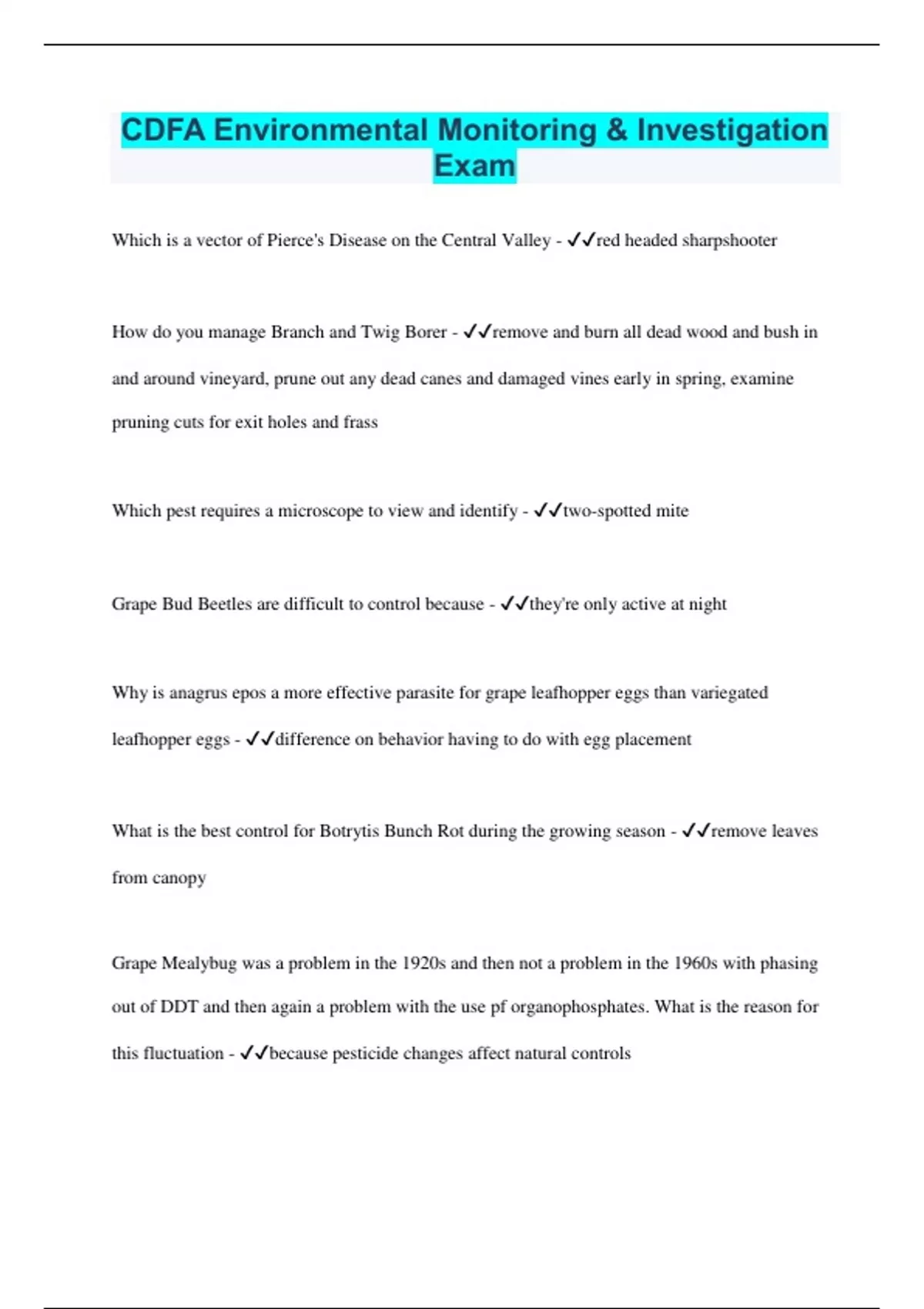 Which is a vector of Pierce's Disease on the Central Valley - red headed sharpshooter How do you manage Branch and Twig Borer - remove and burn all dead wood and bush in and around vineyard, prune out any dead canes and damaged vines early in spring, examine pruning cuts for exit holes and frass Which pest requires a microscope to view and identify - two-spotted mite Grape Bud Beetles are difficult to control because - they're only active at night Why is anagrus epos a more effective parasite for grape leafhopper eggs than variegated leafhopper eggs - difference on behavior having to do with egg placement What is the best control for Botrytis Bunch Rot during the growing season - remove leaves from canopy Grape Mealybug was a problem in the 1920s and then not a problem in the 1960s with phasing out of DDT and then again a problem with the use pf organophosphates. What is the reason for this fluctuation - because pesticide changes affect natural controls
