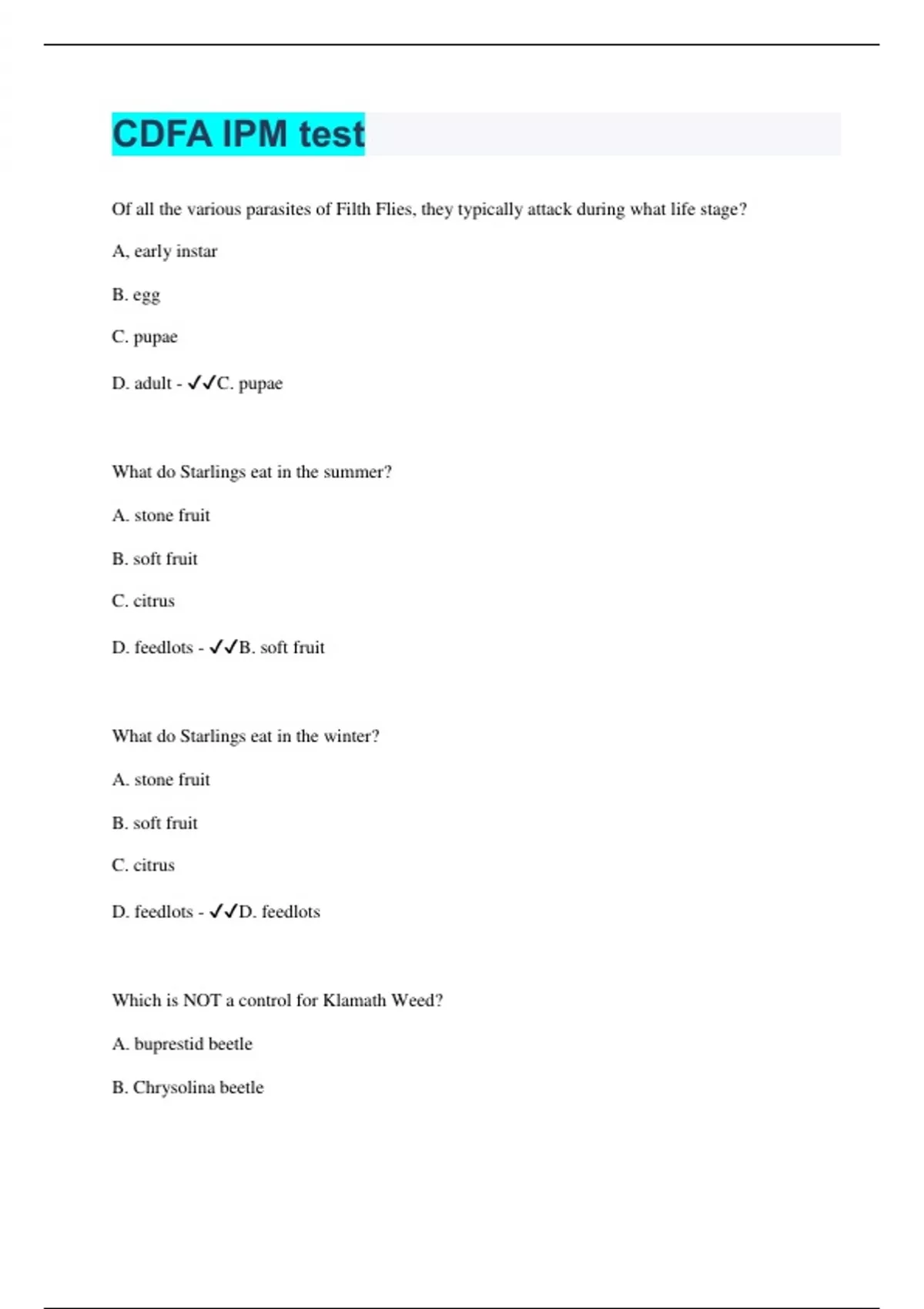 Of all the various parasites of Filth Flies, they typically attack during what life stage? A, early instar B. egg C. pupae D. adult - C. pupae What do Starlings eat in the summer? A. stone fruit B. soft fruit C. citrus D. feedlots - B. soft fruit What do Starlings eat in the winter? A. stone fruit B. soft fruit C. citrus D. feedlots - D. feedlots Which is NOT a control for Klamath Weed? A. buprestid beetle B. Chry