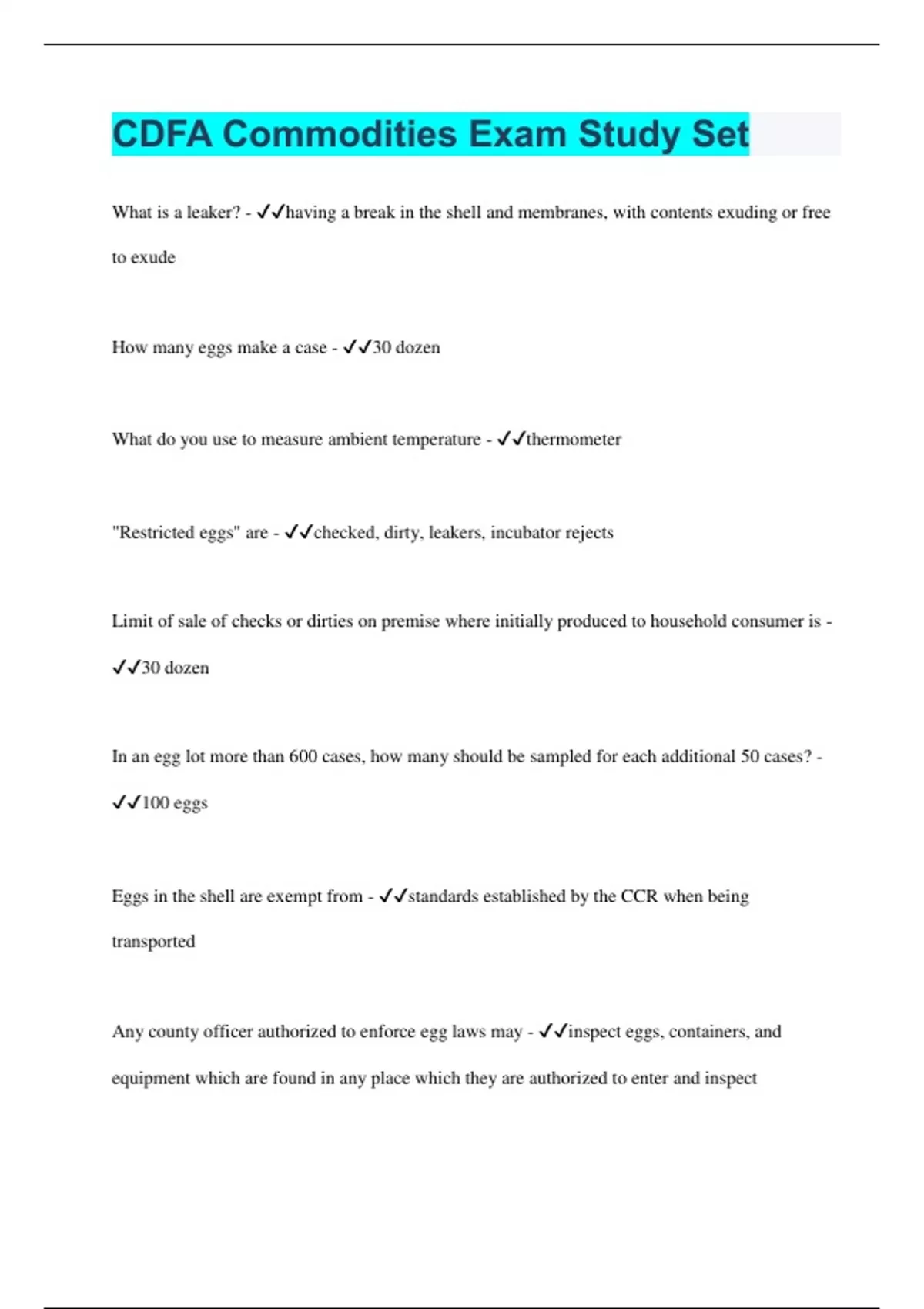 What is a leaker? - having a break in the shell and membranes, with contents exuding or free to exude How many eggs make a case - 30 dozen What do you use to measure ambient temperature - thermometer "Restricted eggs" are - checked, dirty, leakers, incubator rejects Limit of sale of checks or dirties on premise where initially produced to household consumer is - 30 dozen In an egg lot more than 600 cases, how many should be sampled for each additional 50 cases? - 100 eggs Eggs in the shell are exempt from - standards established by the CCR when being transported