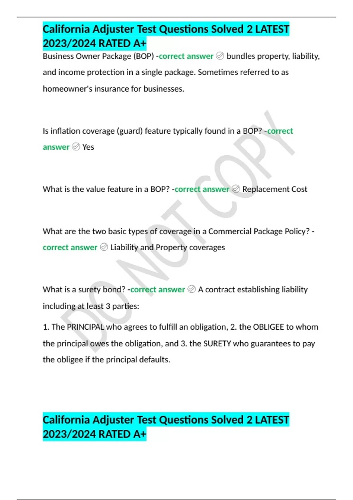 California Adjuster Test Questions Solved 2 LATEST 2023/2024 RATED A+