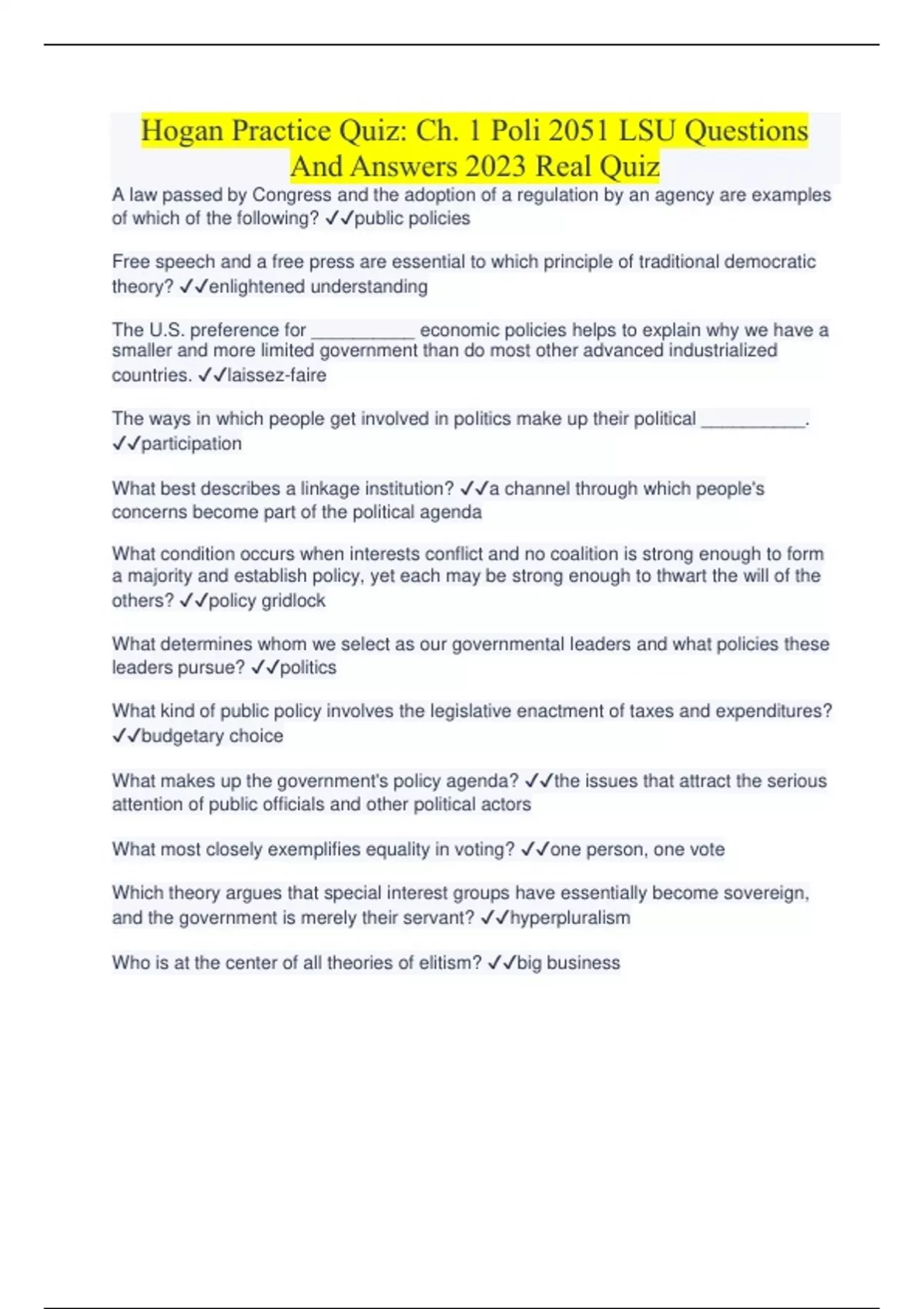 Hogan Practice Quiz: Ch. 1 Poli 2051 LSU Questions And Answers 2023 Real Quiz A law passed by Congress and the adoption of a regulation by an agency are examples of which of the following? public policies Free speech and a free press are essential to which principle of traditional democratic theory? enlightened understanding The U.S. preference for __________ economic policies helps to explain why we have a smaller and more limited government than do most other advanced industrialized countries. laissez-faire The ways in which people get involved in politics make up their political __________. participation