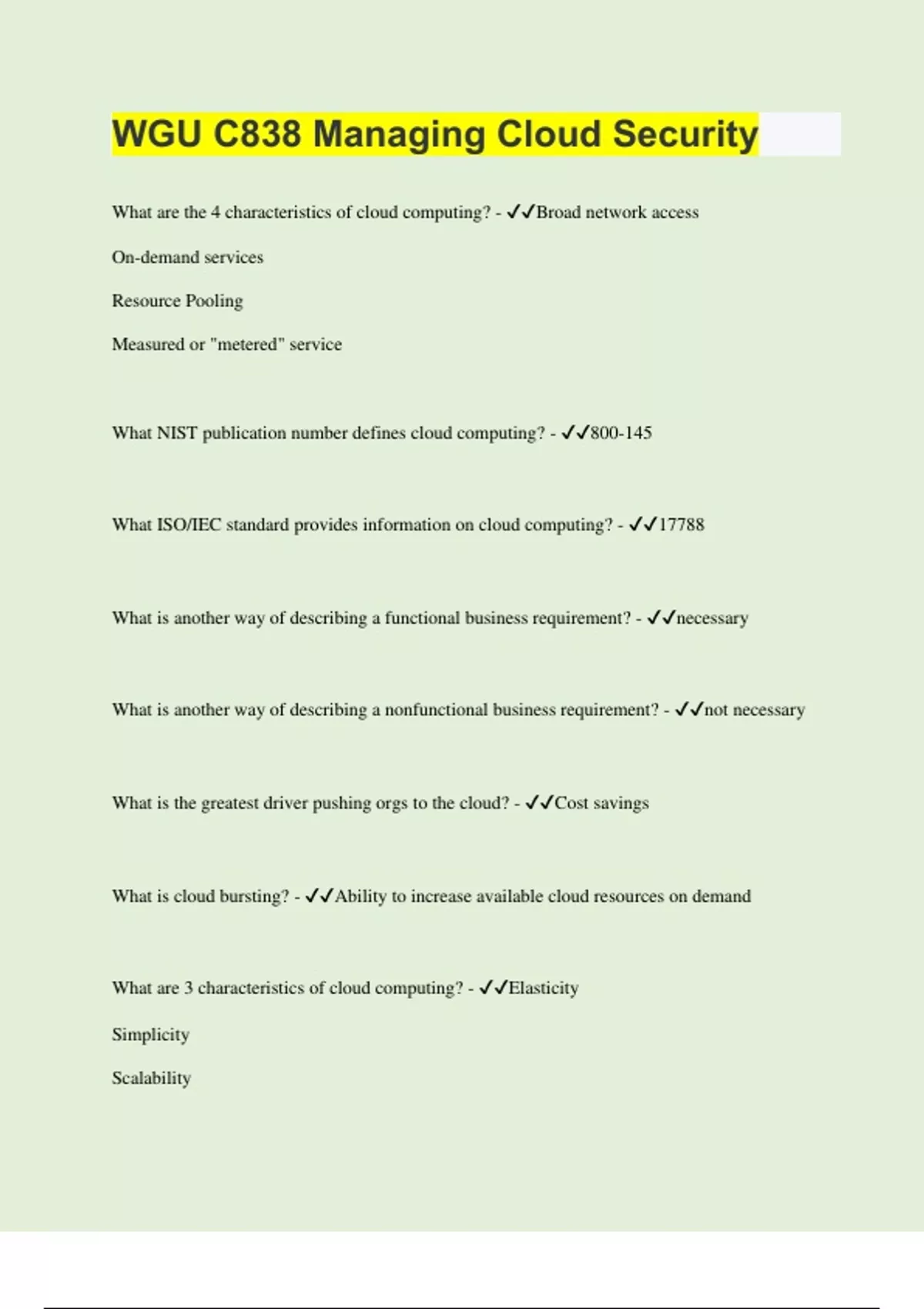 WGU C838 Managing Cloud Security | 432 Questions with 100% Correct Answers | Verified | Latest Update | 62 Pages