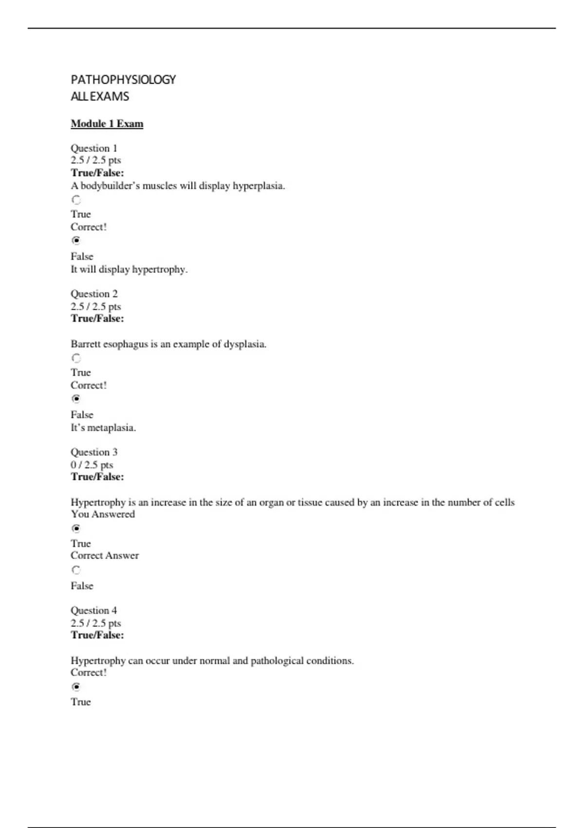 ALLEXAMS Module 1 Exam Question 1 2.5 / 2.5 pts True/False: A bodybuilder’s muscles will display hyperplasia. True Correct! False It will display hypertrophy. Question 2 2.5 / 2.5 pts True/False: Barrett esophagus is an example of dysplasia. True Correct! False It’s metaplasia. Question 3 0 / 2.5 pts True/False: Hypertrophy is an increase in the size of an organ or tissue caused by an increase in the number of cells You Answered True Correct Answer False Question 4 2.5 / 2.5 pts True/False: Hypertrophy can occur under normal and pathological conditions. Correct! TrueFalse Question 5 10 / 10 pts Match the following: Deals with the cause of death in a population a. Incidence Number of new cases in a population at risk during a specified time b. Prevalence Number of people with the disease in a population in a given time c. Morbidity The effect of an illness on one’s life d. Mortality Question 6 2.5 / 2.5 pts Multiple Choice Which is NOT true of the cytoskeleton? It controls shape and movement Cilia and flagella are microtubule-filled cellular extensions Correct! It includes peroxisomes and proteasomes Peroxisomes and proteasomes are not part of the cytoskeleton. Question 7 1.67 / 2.5 pts Which of the following move across the cell membrane via diffusion? Select all that apply. Correct!Oxygen Glucose Correct Answer Water Correct! Carbon dioxide Question 8 2.5 / 2.5 pts Multiple Choice Which of the following are false regarding cell communication? Endocrine signaling depends on hormones Neurotransmitters act through synapses G-protein linked receptors act through an on-off switch Correct! Paracrine signaling releases a chemical into the extracellular fluid that affects its own activity