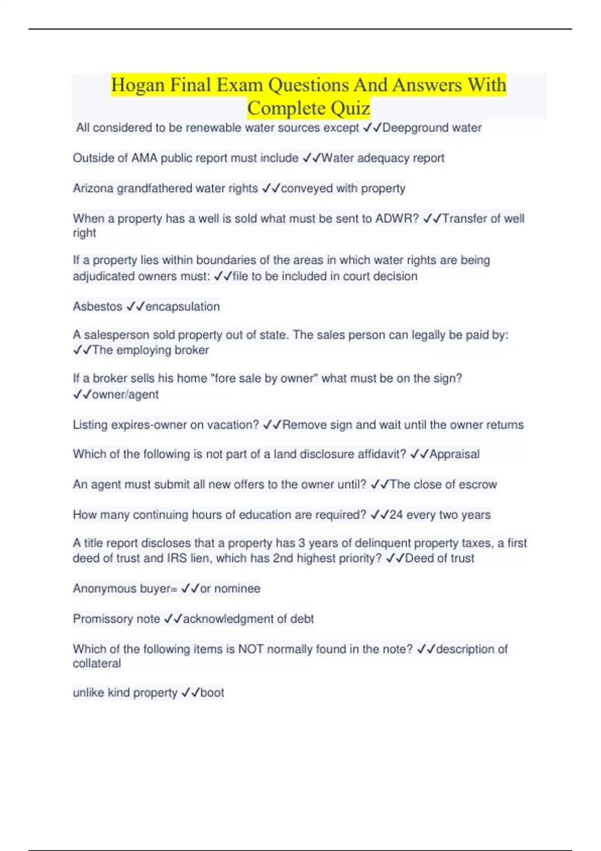 Hogan Final Exam Questions And Answers With Complete Quiz All considered to be renewable water sources except Deepground water Outside of AMA public report must include Water adequacy report Arizona grandfathered water rights conveyed with property When a property has a well is sold what must be sent to ADWR? Transfer of well right If a property lies within boundaries of the areas in which water rights are being adjudicated owners must: file to be included in court decision