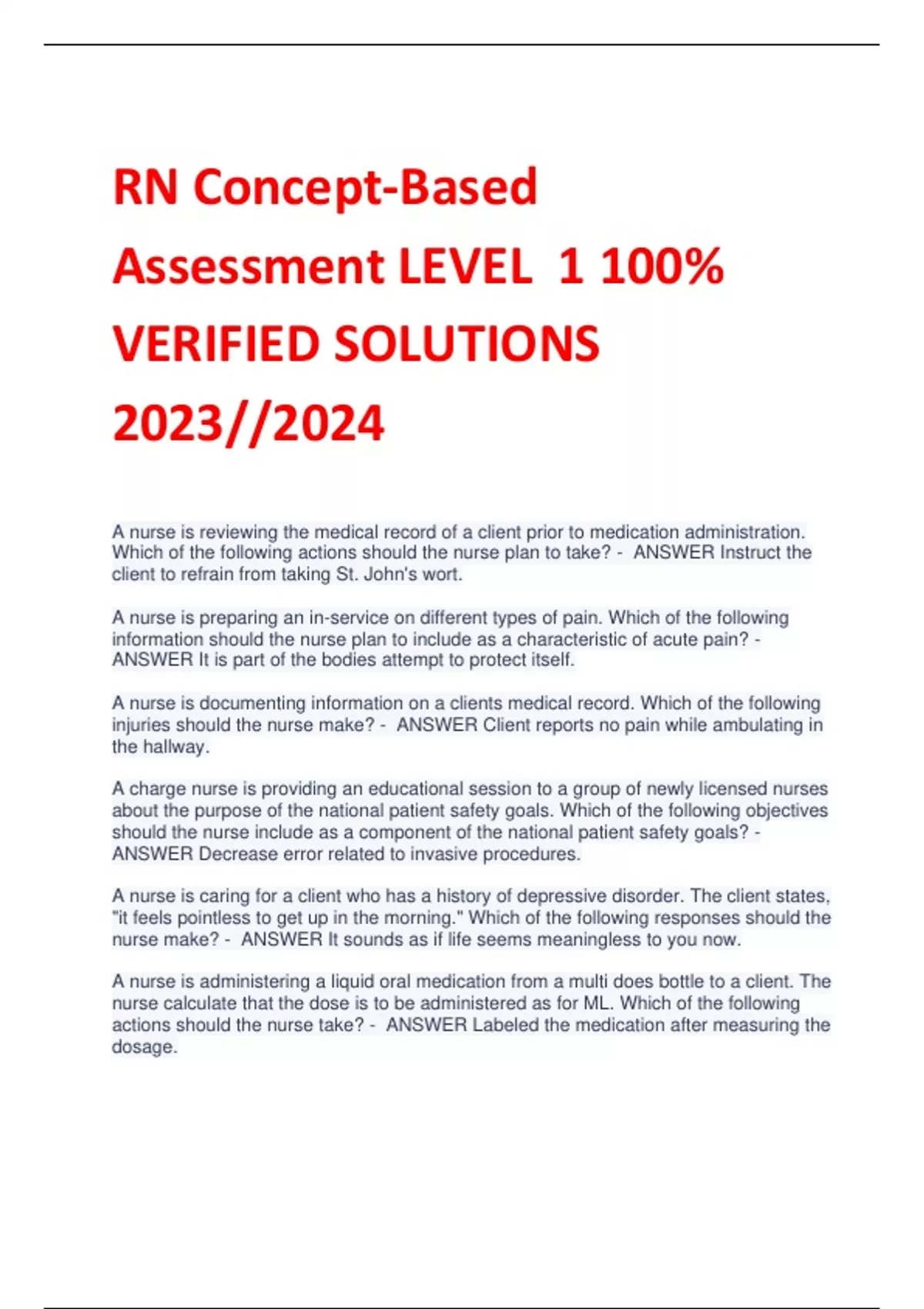 RN Concept-Based Assessment LEVEL 1 100% VERIFIED SOLUTIONS 2023//2024 A nurse is reviewing the medical record of a client prior to medication administration. Which of the following actions should the nurse plan to take? - ANSWER Instruct the client to refrain from taking St. John's wort. A nurse is preparing an in-service on different types of pain. Which of the following information should the nurse plan to include as a characteristic of acute pain? - ANSWER It is part of the bodies attempt to protect itself. A nurse is documenting information on a clients medical record. Which of the following injuries should the nurse make? - ANSWER Client reports no pain while ambulating in the hallway. A charge nurse is providing an educational session to a group of newly licensed nurses about the purpose of the national patient safety goals. Which of the following objectives should the nurse include as a component of the national patient safety goals? - ANSWER Decrease error related to invasive procedures. A nurse is caring for a client who has a history of depressive disorder. The client states, "it feels pointless to get up in the morning." Which of the following responses should the nurse make? - ANSWER It sounds as if life seems meaningless to you now. A nurse is administering a liquid oral medication from a multi does bottle to a client. The nurse calculate that the dose is to be administered as for ML. Which of the following actions should the nurse take? - ANSWER Labeled the medication after measuring the dosage. A nurse is teaching a group of Parents and guardians about identifying substance use disorder among adolescents. Which of the following adolescent behaviors should the nurse include as a possible indication of substance use disorder? - ANSWER Wearing dark glasses indoors A community health nurse is teaching a group of older adult client at a senior center. Which of the following factors should the nurse include as an age related change the increases the risk for constipation an older adult clients? - ANSWER Delayed gastric emptying. A nurse is disgusting informed consent with a group of newly licensed nurses. Which of the following actions is the responsibility of the nurse when obtaining informed consent? - ANSWER Verify that the client voluntarily gave consent for the procedure A nurse is providing handoff report on a client. Which of the following information should the nurse include in the report? - ANSWER The client is scheduled for a chest x-ray on the next shift