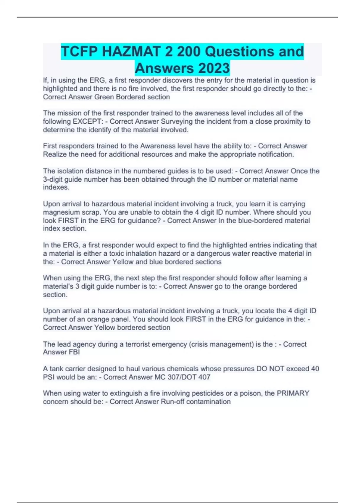 If, in using the ERG, a first responder discovers the entry for the material in question is highlighted and there is no fire involved, the first responder should go directly to the: - Correct Answer Green Bordered section The mission of the first responder trained to the awareness level includes all of the following EXCEPT: - Correct Answer Surveying the incident from a close proximity to determine the identify of the material involved. First responders trained to the Awareness level have the ability to: - Correct Answer Realize the need for additional resources and make the appropriate notification. The isolation distance in the numbered guides is to be used: - Correct Answer Once the 3-digit guide number has been obtained through the ID number or material name indexes. Upon arrival to hazardous material incident involving a truck, you learn it is carrying magnesium scrap. You are unable to obtain the 4 digit ID number. Where should you look FIRST in the ERG for guidance? - Correct Answer In the blue-bordered material index section. In the ERG, a first responder would expect to find the highlighted entries indicating that a material is either a toxic inhalation hazard or a dangerous water reactive material in the: - Correct Answer Yellow and blue bordered sections When using the ERG, the next step the first responder should follow after learning a material's 3 digit guide number is to: - Correct Answer go to the orange bordered section. Upon arrival at a hazardous material incident involving a truck, you locate the 4 digit ID number of an orange panel. You should look FIRST in the ERG for guidance in the: - Correct Answer Yellow bordered section The lead agency during a terrorist emergency (crisis management) is the : - Correct Answer FBI A tank carrier designed to haul various chemicals whose pressures DO NOT exceed 40 PSI would be an: - Correct Answer MC 307/DOT 407 When using water to extinguish a fire involving pesticides or a poison, the PRIMARY concern should be: - Correct Answer Run-off contamination