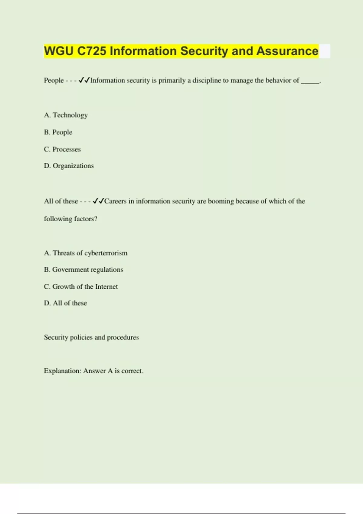 People - - - Information security is primarily a discipline to manage the behavior of _____. A. Technology B. People C. Processes D. Organizations All of these - - - Careers in information security are booming because of which of the following factors? A. Threats of cyberterrorism B. Government regulations C. Growth of the Internet D. All of these Security policies and procedures Explanation: Answer A is correct