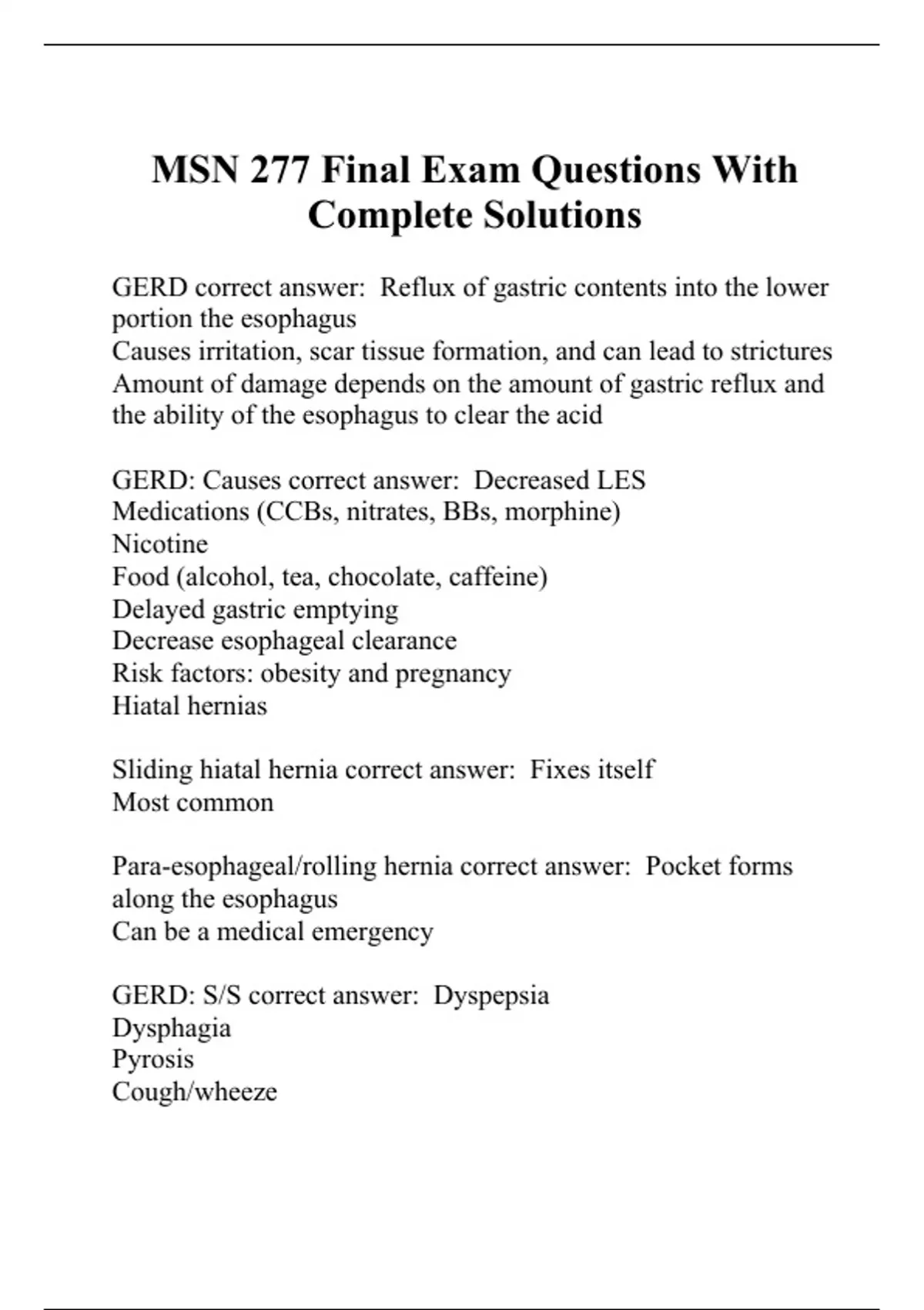 GERD correct answer: Reflux of gastric contents into the lower portion the esophagus Causes irritation, scar tissue formation, and can lead to strictures Amount of damage depends on the amount of gastric reflux and the ability of the esophagus to clear the acid GERD: Causes correct answer: Decreased LES Medications (CCBs, nitrates, BBs, morphine) Nicotine Food (alcohol, tea, chocolate, caffeine) Delayed gastric emptying Decrease esophageal clearance Risk factors: obesity and pregnancy Hiatal hernias Sliding hiatal hernia correct answer: Fixes itself Most common Para-esophageal/rolling hernia correct answer: Pocket forms along the esophagus Can be a medical emergency GERD: S/S correct answer: Dyspepsia Dysphagia Pyrosis Cough/wheeze Globulus sensation Dyspnea Nocturnal discomfort Non-cardiac chest pain