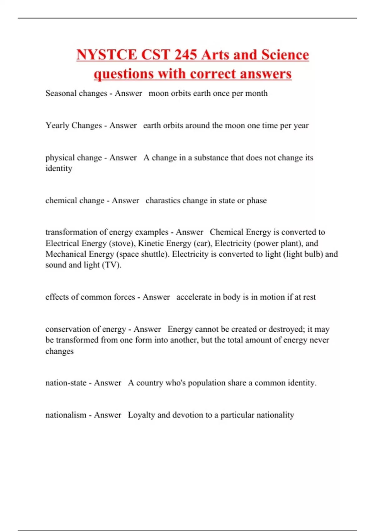 Seasonal changes - Answer moon orbits earth once per month Yearly Changes - Answer earth orbits around the moon one time per year physical change - Answer A change in a substance that does not change its identity chemical change - Answer charastics change in state or phase transformation of energy examples - Answer Chemical Energy is converted to Electrical Energy (stove), Kinetic Energy (car), Electricity (power plant), and Mechanical Energy (space shuttle). Electricity is converted to light (light bulb) and sound and light (TV). effects of common forces - Answer accelerate in body is in motion if at rest conservation of energy - Answer Energy cannot be created or destroyed; it may be transformed from one form into another, but the total amount of energy never changes nation-state - Answer A country who's population share a common identity.