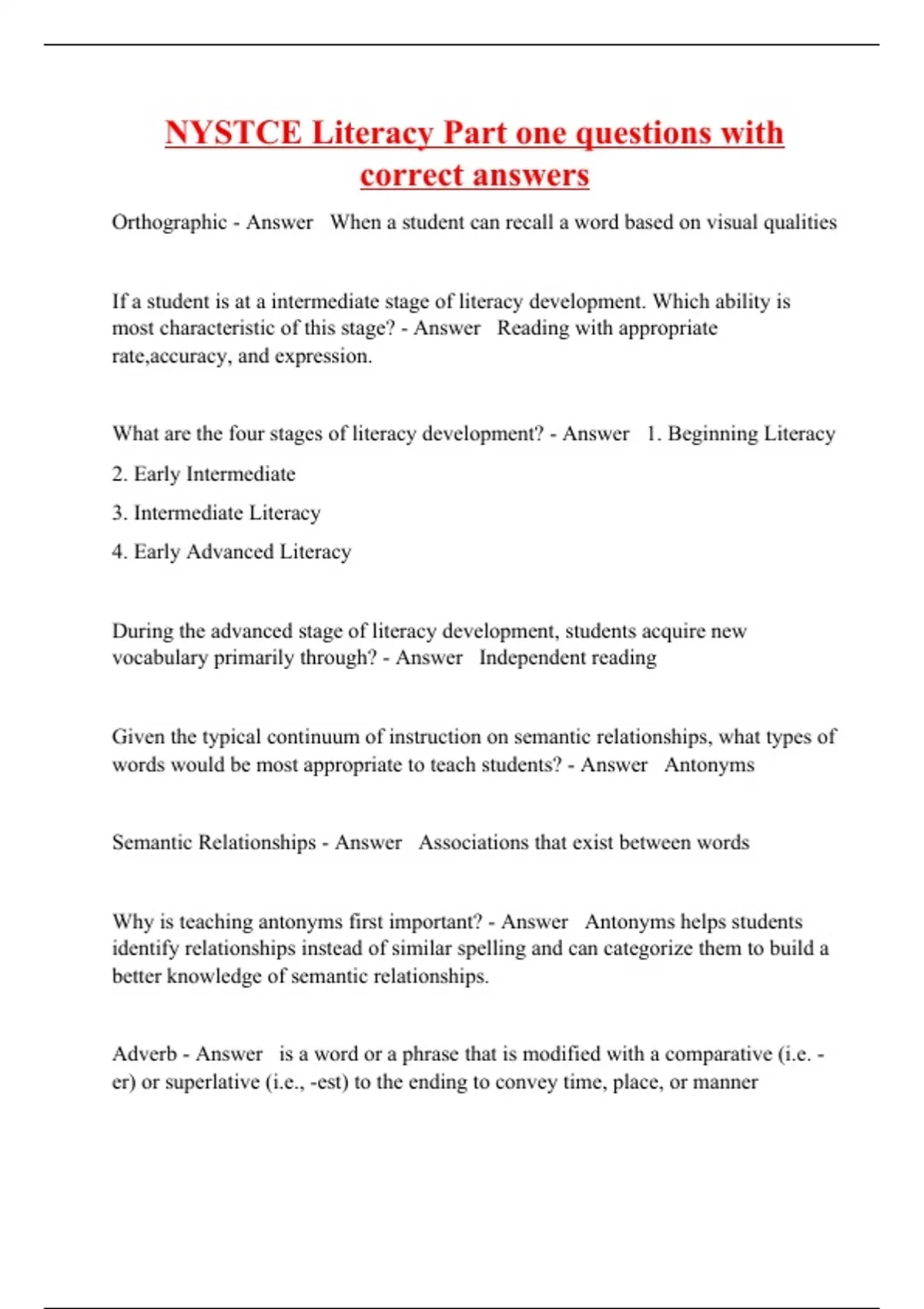 Orthographic - Answer When a student can recall a word based on visual qualities If a student is at a intermediate stage of literacy development. Which ability is most characteristic of this stage? - Answer Reading with appropriate rate,accuracy, and expression. What are the four stages of literacy development? - Answer 1. Beginning Literacy 2. Early Intermediate 3. Intermediate Literacy 4. Early Advanced Literacy During the advanced stage of literacy development, students acquire new vocabulary primarily through? - Answer Independent reading Given the typical continuum of instruction on semantic relationships, what types of words would be most appropriate to teach students? - Answer Antonyms Semantic Relationships - Answer Associations that exist between words Why is teaching antonyms first important? - Answer Antonyms helps students identify relationships instead of similar spelling and can categorize them to build a better knowledge of semantic relationships.