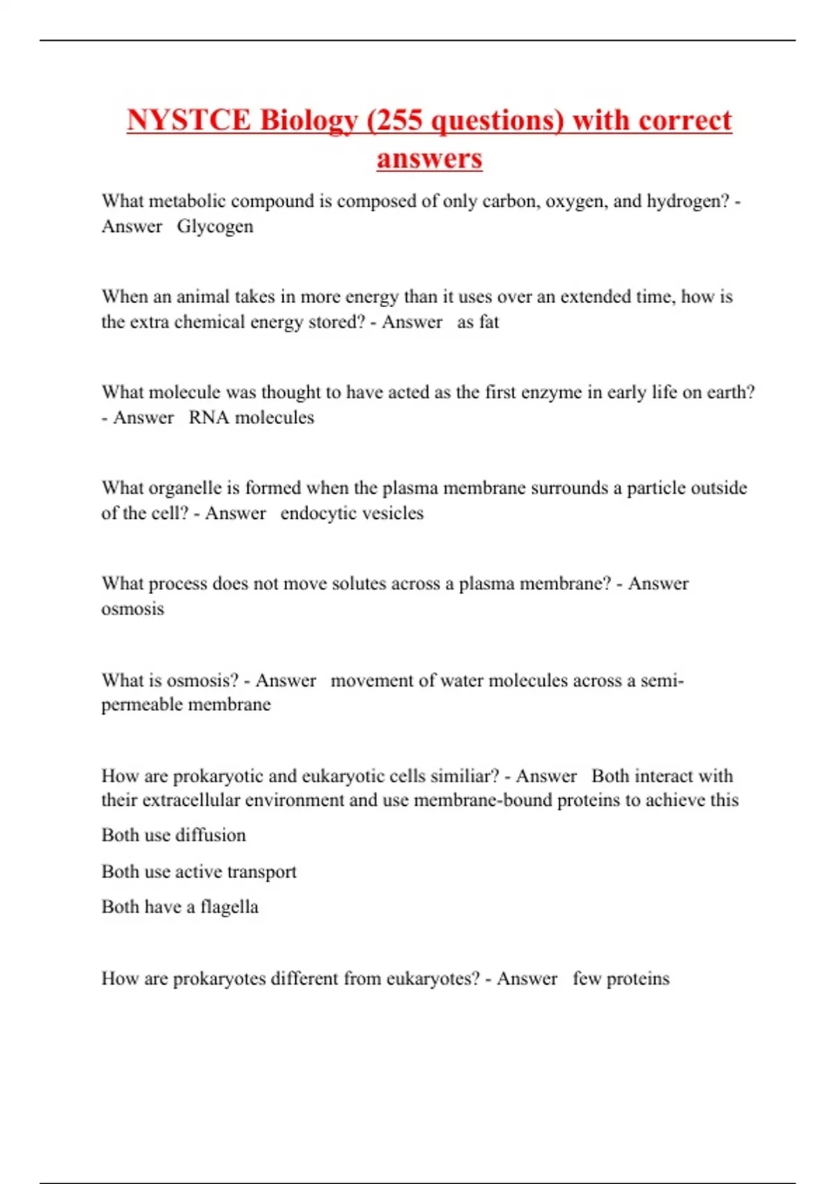 What metabolic compound is composed of only carbon, oxygen, and hydrogen? - Answer Glycogen When an animal takes in more energy than it uses over an extended time, how is the extra chemical energy stored? - Answer as fat What molecule was thought to have acted as the first enzyme in early life on earth? - Answer RNA molecules What organelle is formed when the plasma membrane surrounds a particle outside of the cell? - Answer endocytic vesicles What process does not move solutes across a plasma membrane? - Answer osmosis What is osmosis? - Answer movement of water molecules across a semi-permeable membrane How are prokaryotic and eukaryotic cells similiar? - Answer Both interact with their extracellular environment and use membrane-bound proteins to achieve this Both use diffusion Both use active transport Both have a flagella