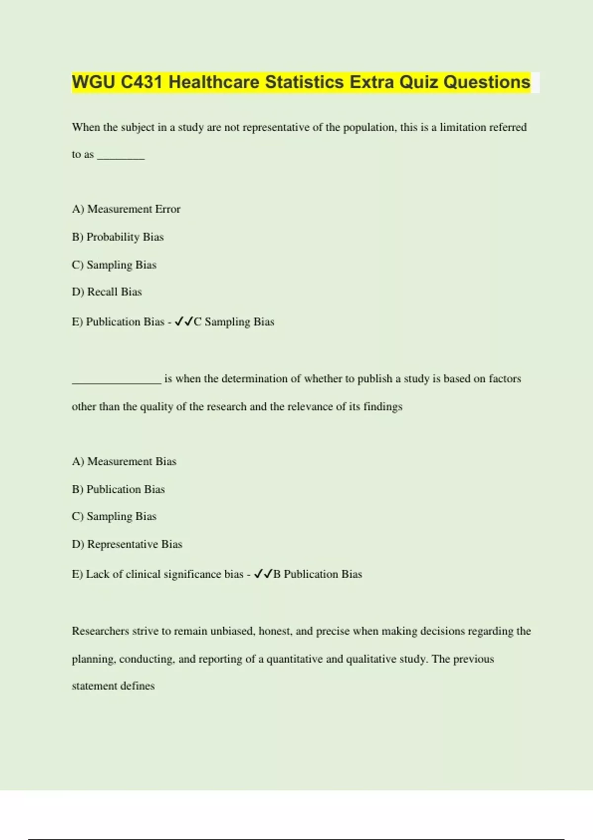 When the subject in a study are not representative of the population, this is a limitation referred to as ________ A) Measurement Error B) Probability Bias C) Sampling Bias D) Recall Bias E) Publication Bias - C Sampling Bias _______________ is when the determination of whether to publish a study is based on factors other than the quality of the research and the relevance of its findings A) Measurement Bias B) Publication Bias C) Sampling Bias D) Representative Bias E) Lack of clinical significance bias - B Publication Bias Researchers strive to remain unbiased, honest, and precise when making decisions regarding the planning, conducting, and reporting of a quantitative and qualitative study. The previous statement defines