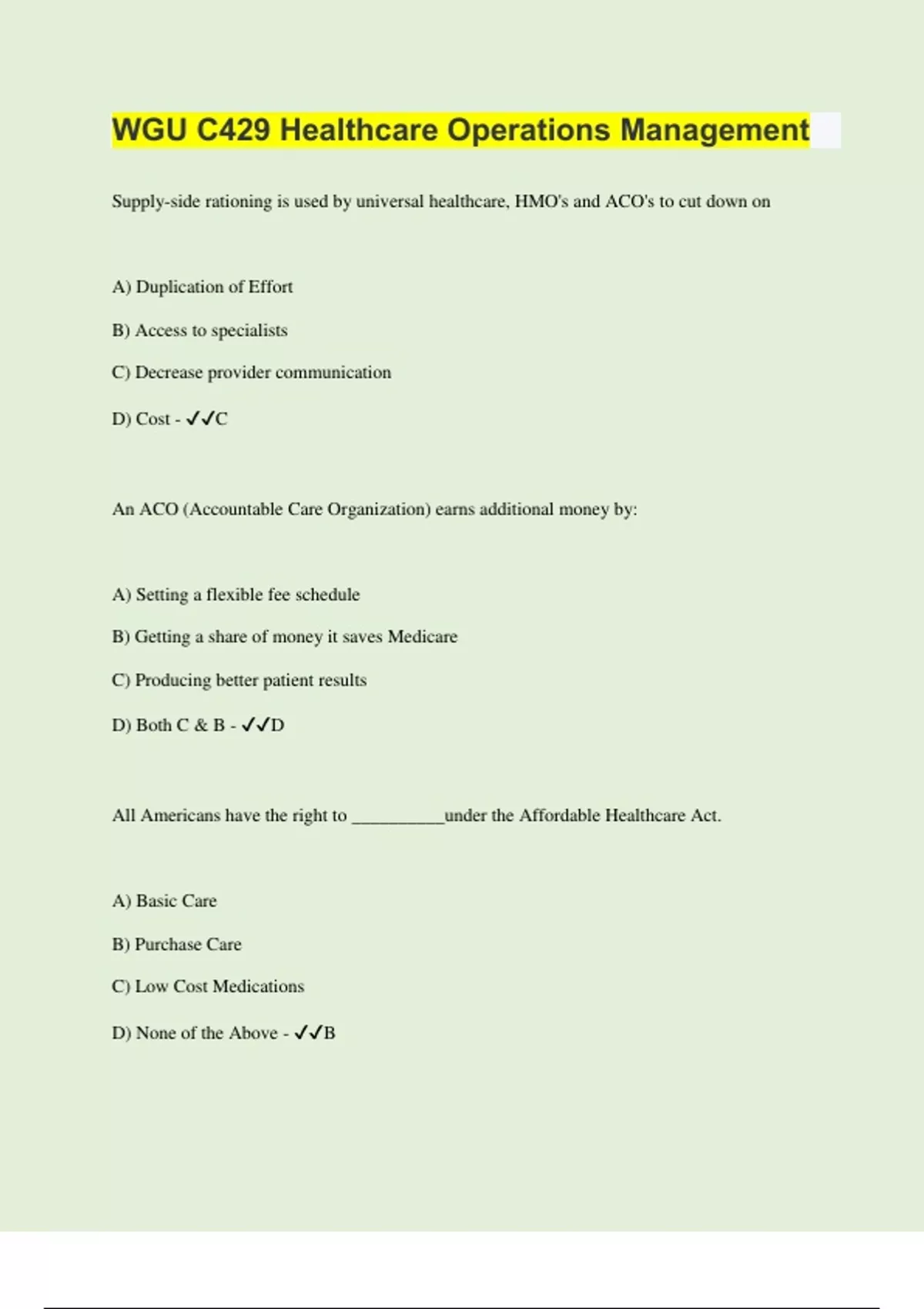 Supply-side rationing is used by universal healthcare, HMO's and ACO's to cut down on A) Duplication of Effort B) Access to specialists C) Decrease provider communication D) Cost - C An ACO (Accountable Care Organization) earns additional money by: A) Setting a flexible fee schedule B) Getting a share of money it saves Medicare C) Producing better patient results D) Both C & B - D All Americans have the right to __________under the Affordable Healthcare Act. A) Basic Care B) Purchase Care C) Low Cost Medications D) None of the Above - B