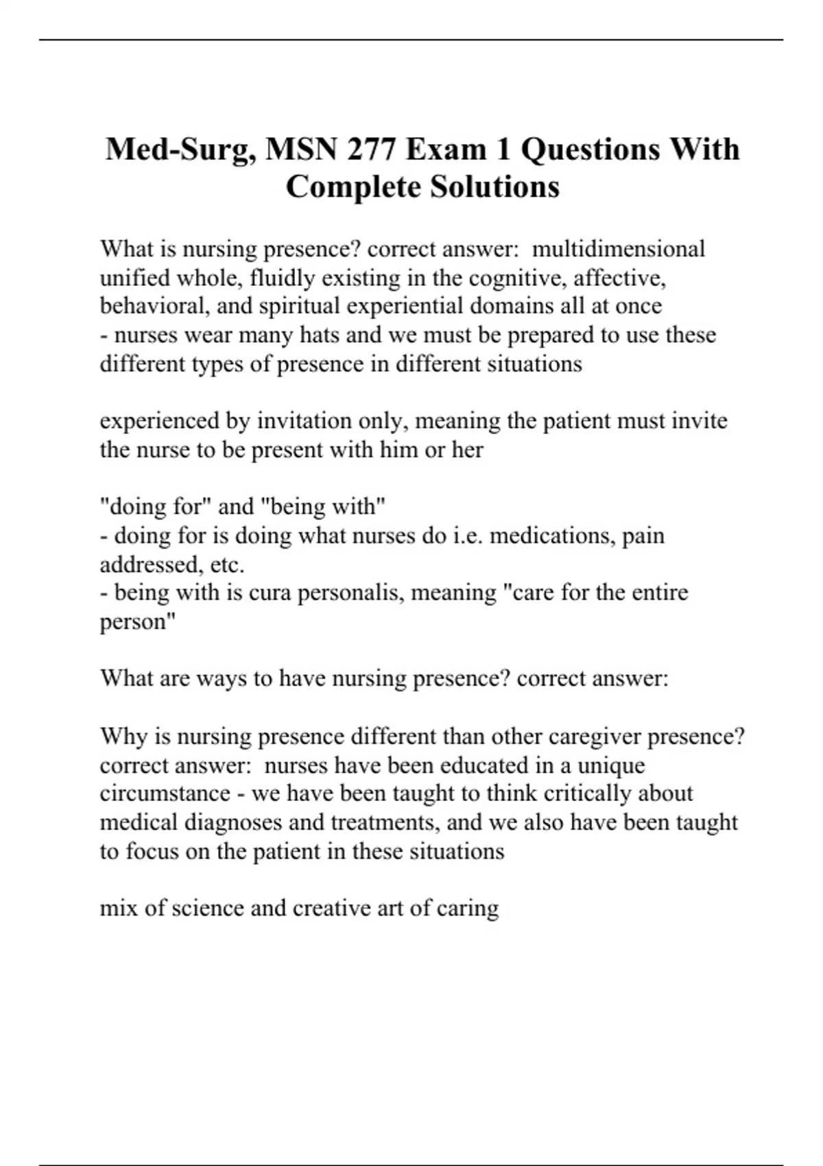 What is nursing presence? correct answer: multidimensional unified whole, fluidly existing in the cognitive, affective, behavioral, and spiritual experiential domains all at once - nurses wear many hats and we must be prepared to use these different types of presence in different situations experienced by invitation only, meaning the patient must invite the nurse to be present with him or her "doing for" and "being with" - doing for is doing what nurses do i.e. medications, pain addressed, etc. - being with is cura personalis, meaning "care for the entire person" What are ways to have nursing presence? correct answer: Why is nursing presence different than other caregiver presence? correct answer: nurses have been educated in a unique circumstance - we have been taught to think critically about medical diagnoses and treatments, and we also have been taught to focus on the patient in these situations mix of science and creative art of caring we have a way of being present that differs from other health care disparities