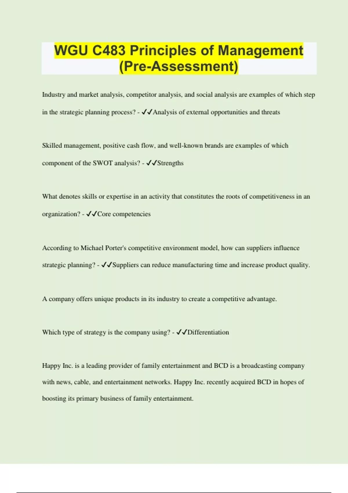 WGU C483 Principles of Management (Pre-Assessment) | 115 Questions with 100% Correct Answers | Verified | Latest Update | 28 Pages