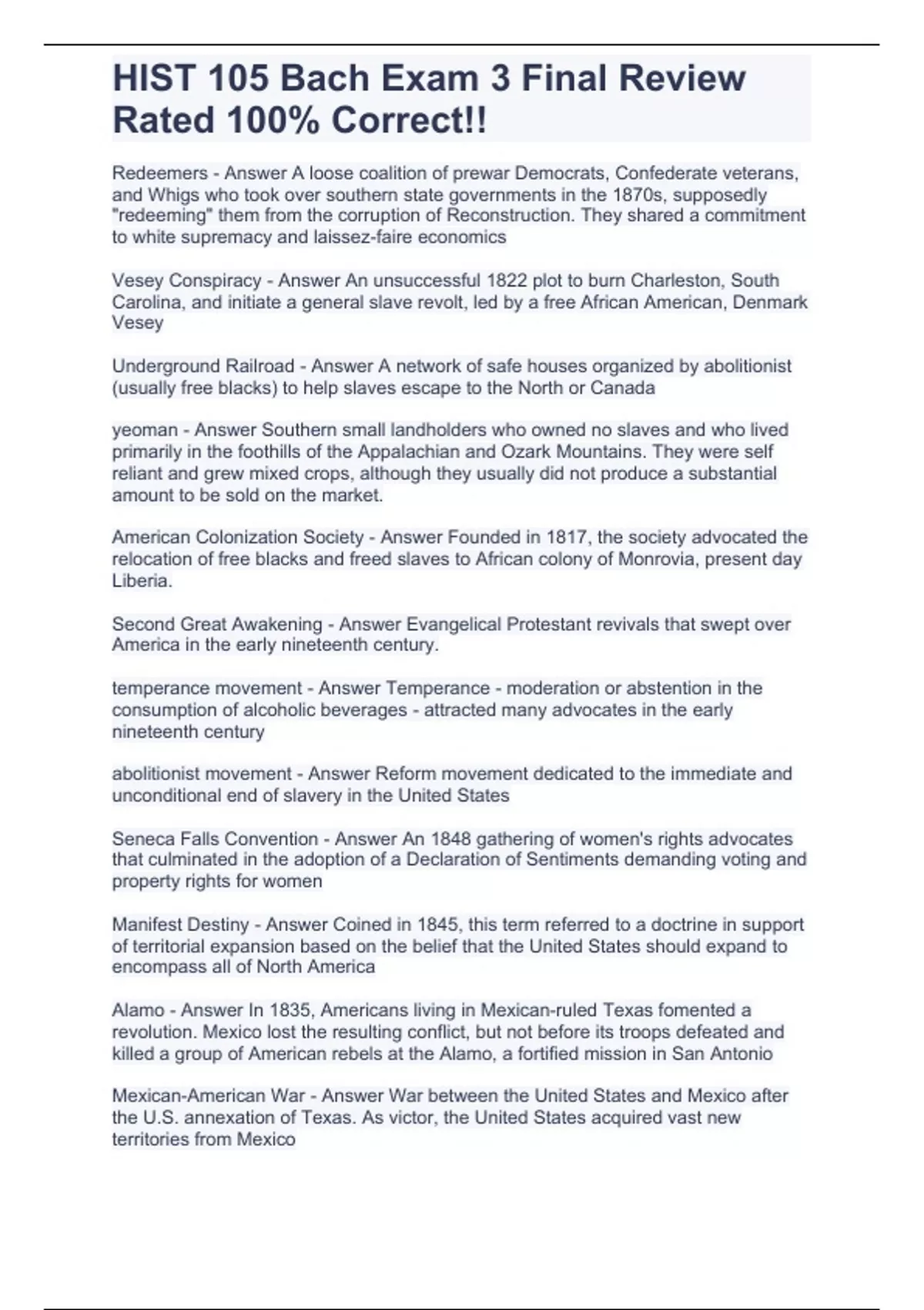 HIST 105 Bach Exam 3 Final Review Rated 100% Correct!!