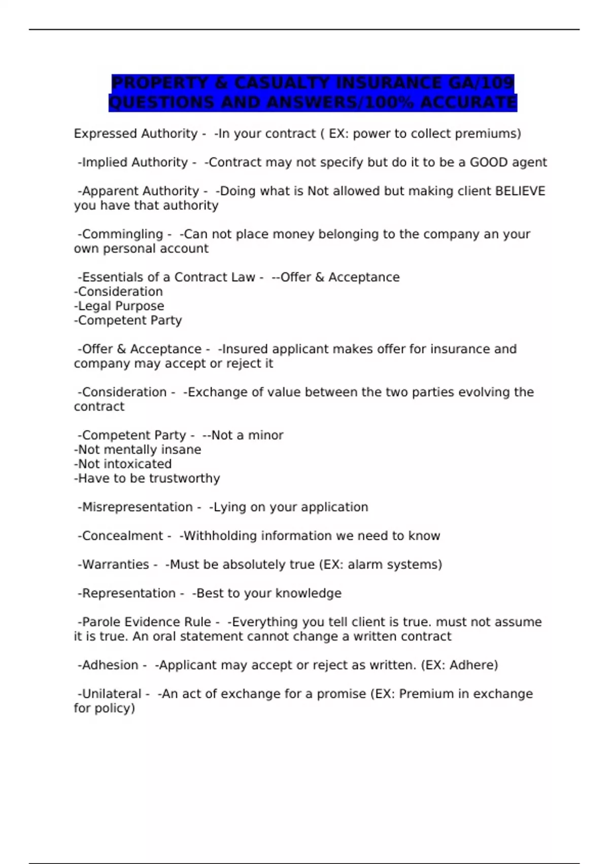 PROPERTY & CASUALTY INSURANCE GA/109 QUESTIONS AND ANSWERS/100% ACCURATE