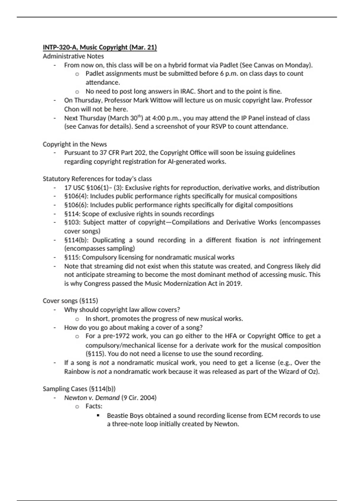 INTP-320 Copyright Law Class 18 (Music Copyright)