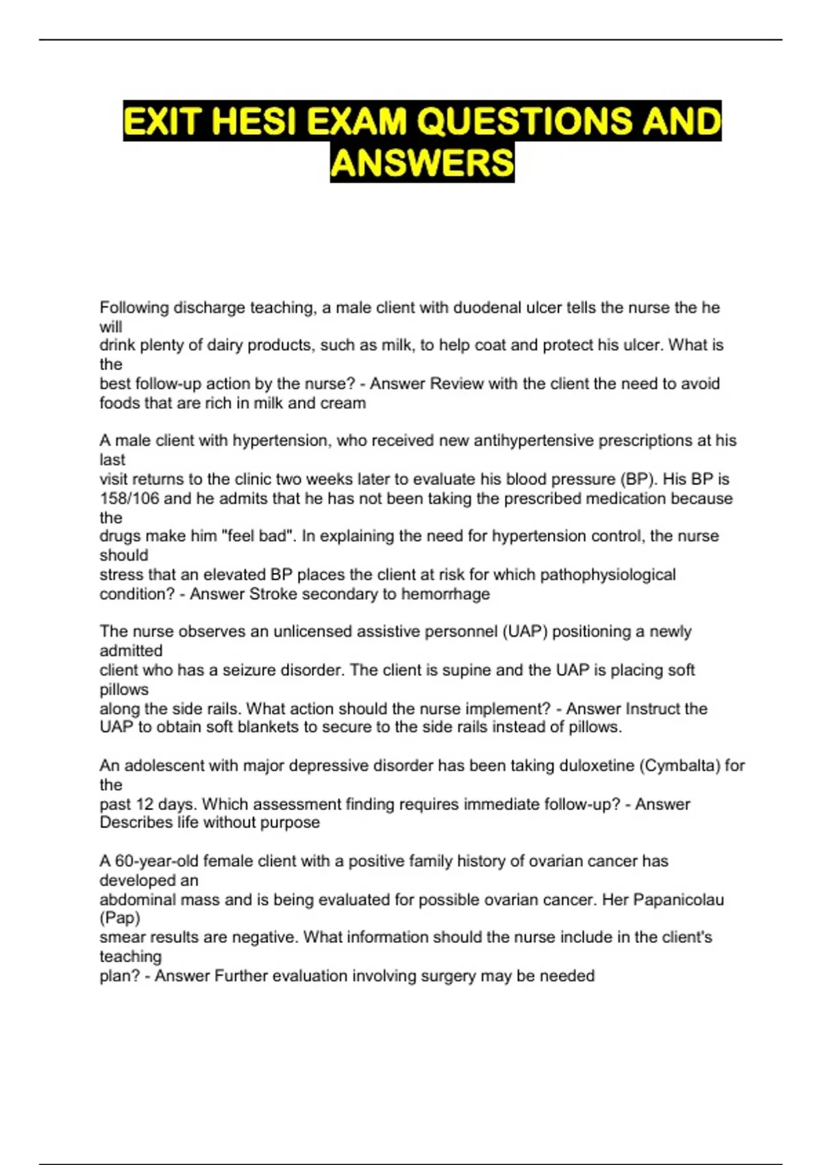 EXIT HESI EXAM QUESTIONS AND ANSWERS...